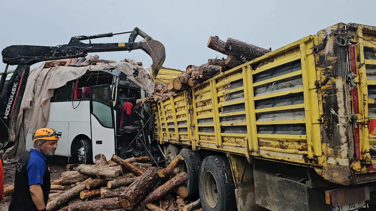 Kaza nedeniyle yol trafiğe kapanırken ekipler, otobüs ve kamyonu yoldan kaldırmak için iş makineleri ile çalışma başlattı.