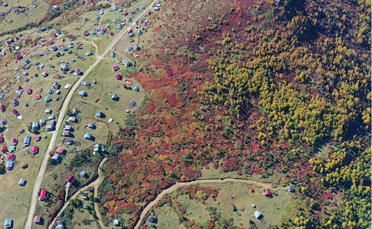 Güz mevsiminin tüm renklerinin bir arada görülebildiği bölgede, sonbahar renklerinin arasında kaybolan yayla evleri de ayrı bir güzellik sunuyor.