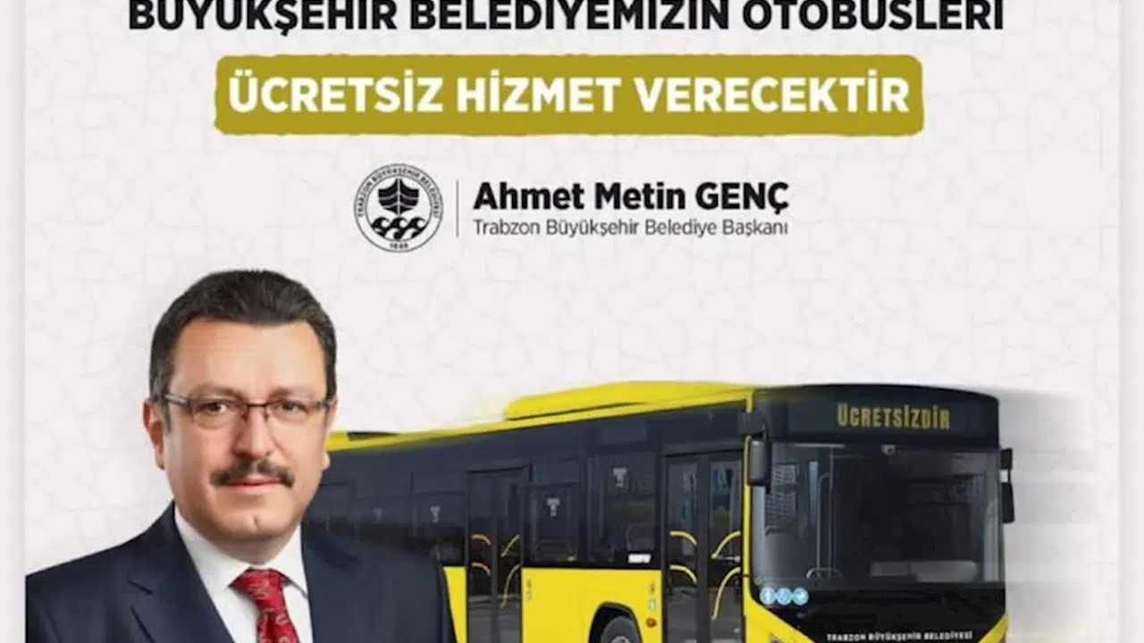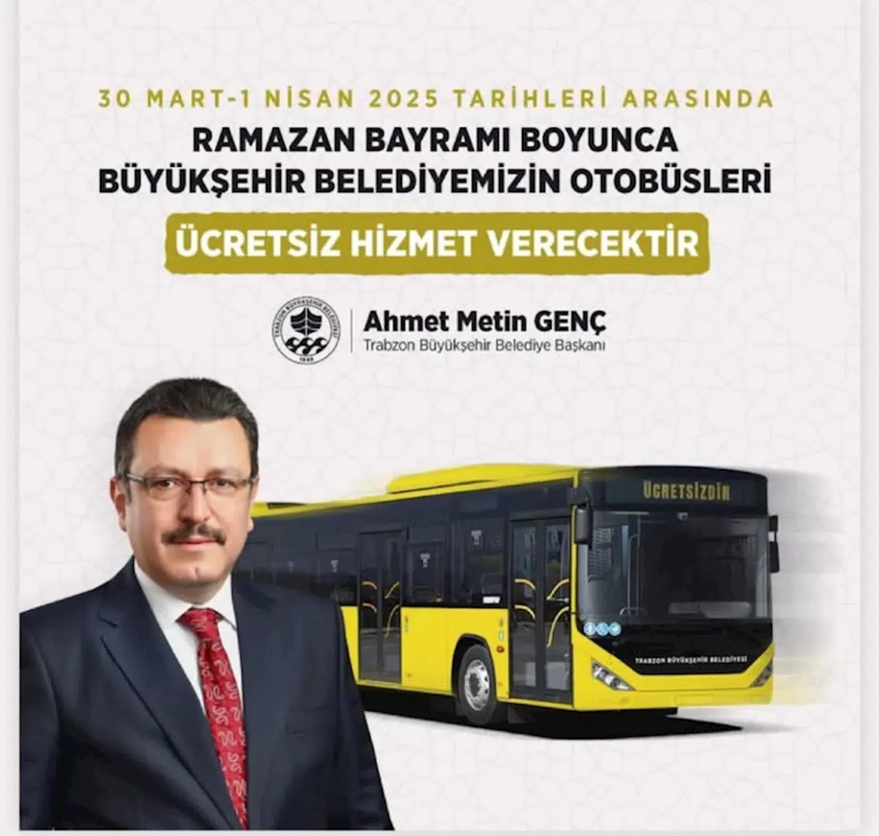 Trabzon Büyükşehir Belediyesi, Ramazan Bayramı boyunca toplu taşıma hizmetlerini ücretsiz sunacak. Vatandaşlar, Ramazan Bayramı’nın birinci günü olan 31 Mart Pazar günü ile bayramın son günü 1 Nisan tarihleri arasında 3 gün boyunca Büyükşehir Belediyesi’ne ait toplu taşıma araçlarından ücretsiz faydalanabilecek. Büyükşehir Belediyesi’nden yapılan açıklamada, "Otobüslerimiz, 3 günlük bayram süresi boyunca pazar günlerindeki sefer saatlerine göre, 2, 3 ve 4 Nisan'da ise cumartesi günlerindeki sefer saatlerine göre hizmet verecek. Bütün vatandaşlarımızın bayramını kutluyor, sağlıklı ve huzurlu nice bayramlar diliyoruz” denildi.
