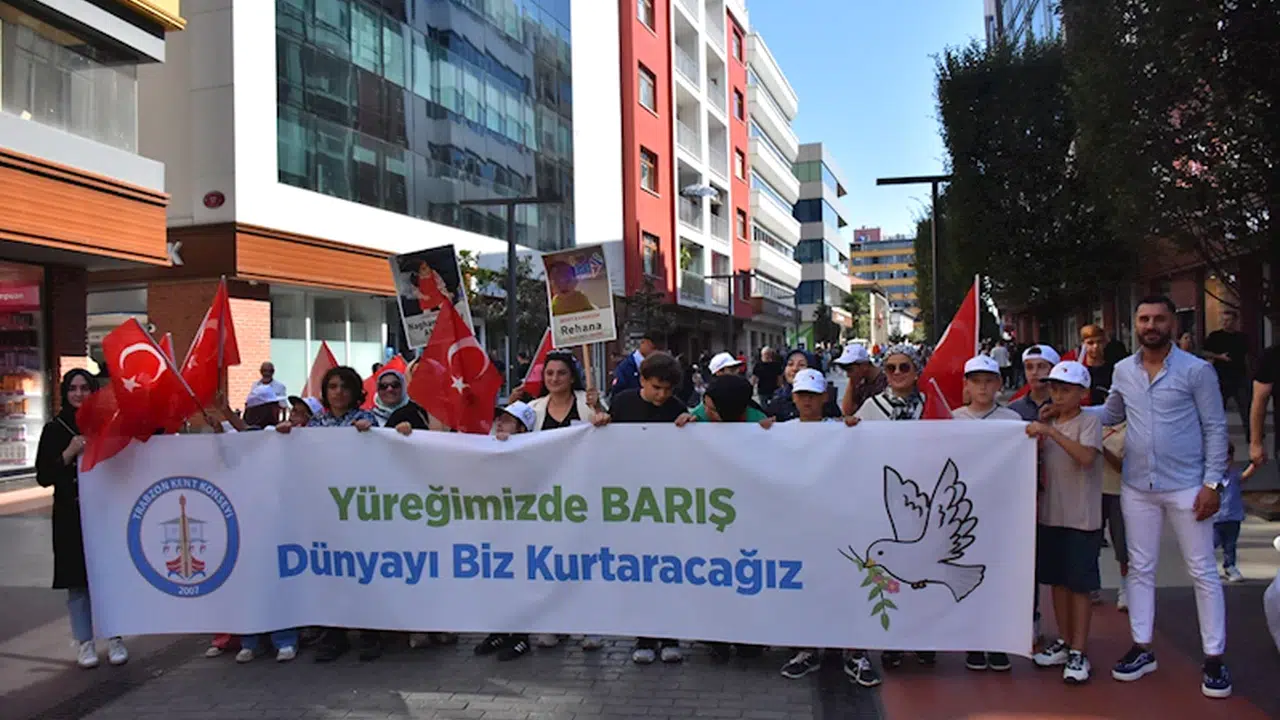 Trabzon Büyükşehir Belediyesi Kent Konseyi Kadın Meclisi tarafından organize edilen programa katılan çocuklar ve aileleri, Kahramanmaraş Caddesi'nden 15 Temmuz Şehitleri ve Hürriyet Parkı'na kadar "Savaş değil barış", "Savaşa hayır, barışa evet" ve "Çocuklar ölmesin" sloganlarıyla yürüdü.