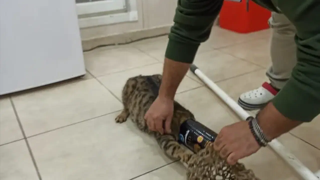 Olay yerine gelen veteriner hekim Ahmet Köz, kedinin boynundaki teneke kutuyu çıkarttı.