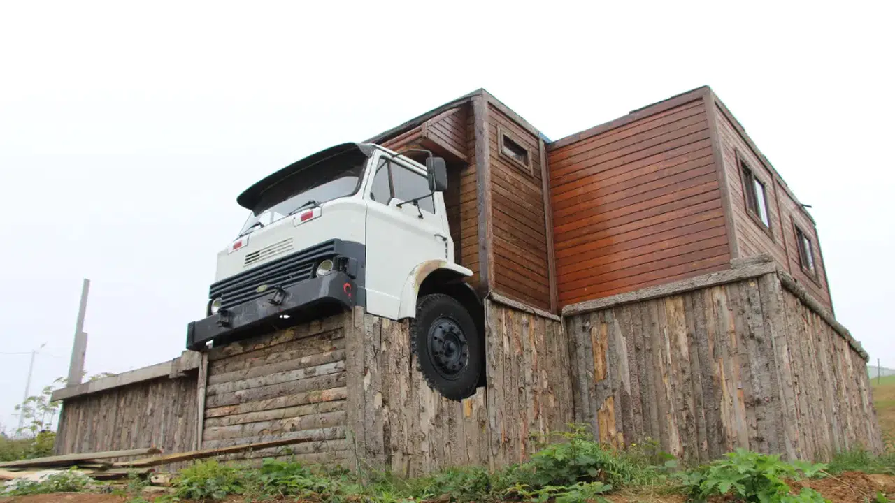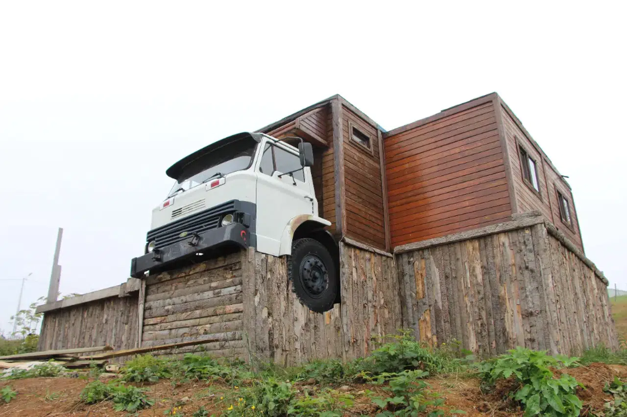 Ahşap yapısıyla dikkat çeken bu kamyon, şimdi beton direkler üzerinde yükselen bir ev olarak görenleri büyülemeye devam ediyor.