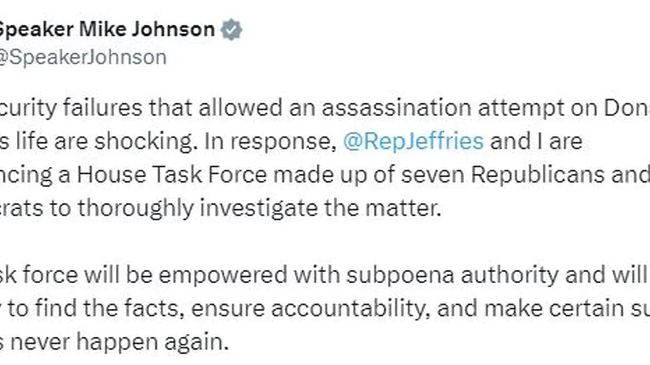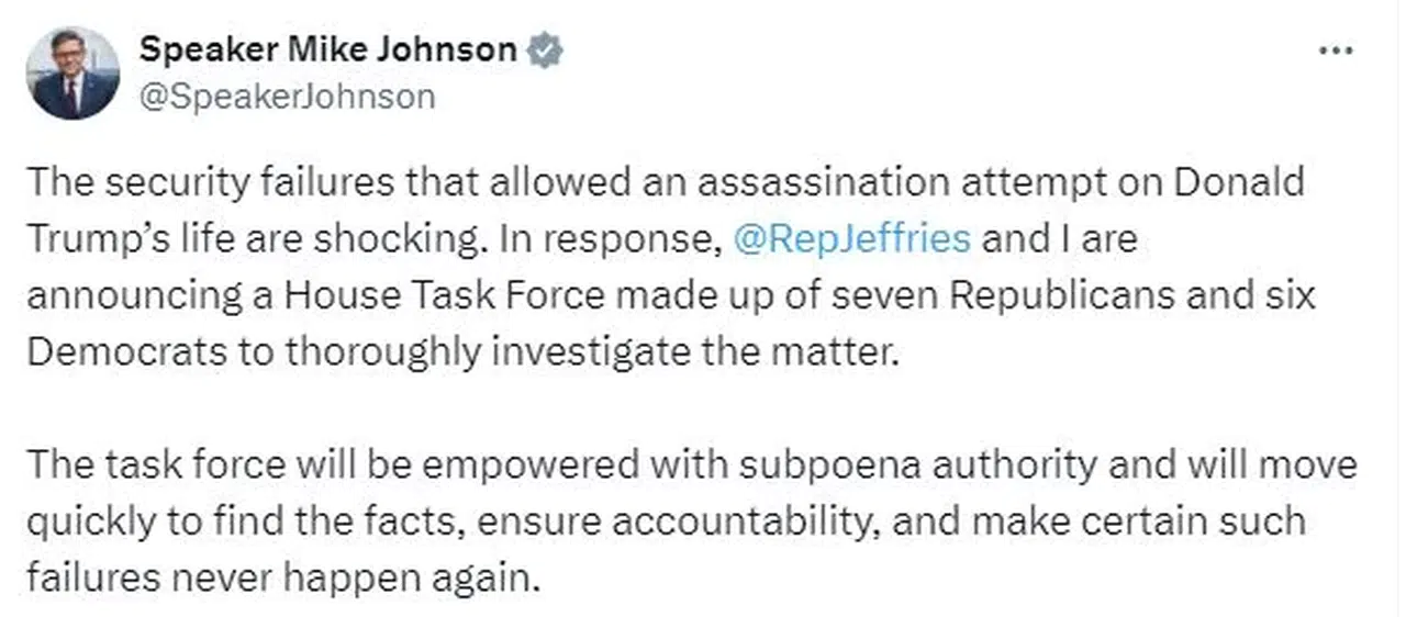 ABD Temsilciler Meclisi Başkanı Johnson, yaptığı açıklamada, “Donald Trump'ın hayatına yönelik bir suikast girişimine izin veren güvenlik hataları şok edicidir. Buna cevaben, Kongre Üyesi Hakeem Jeffries ve ben, konuyu derinlemesine araştırmak üzere 7 Cumhuriyetçi ve 6 Demokrattan oluşan bir Meclis Görev Gücü oluşturduğumuzu ilan ediyoruz. Görev gücü mahkeme celbi yetkisine sahip olacak ve gerçekleri bulmak, hesap verebilirliği sağlamak ve bu tür başarısızlıkların bir daha asla yaşanmamasını sağlamak için hızla hareket edecektir” dedi.