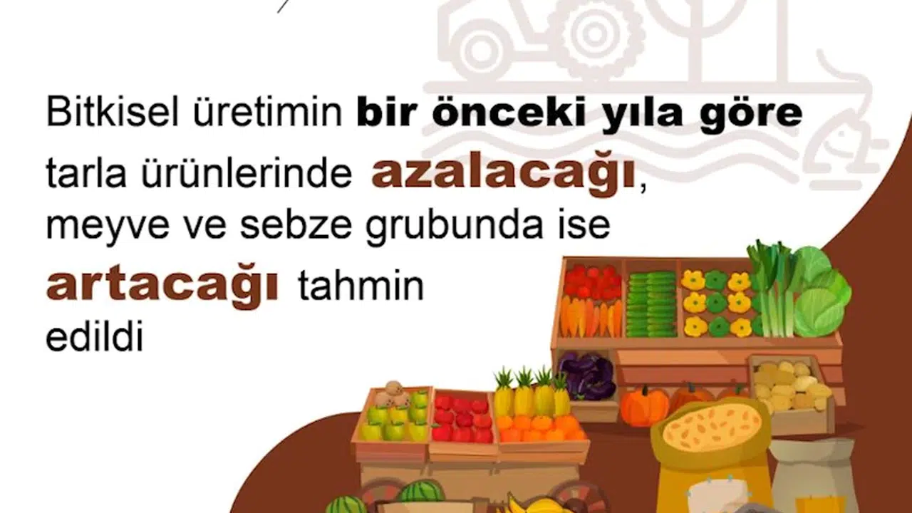 TÜİK, Tarım ve Orman Bakanlığı tarafından hazırlanan 'Bitkisel Üretim 1'inci Tahmini, 2024' bültenini yayımladı. Buna göre; üretim miktarlarının, 2024 yılı ilk tahmininde bir önceki yıla göre tarla ürünleri olan tahıllar ve diğer bitkisel ürünlerde (yem bitkileri hariç) yüzde 2 azalacağı; sebzelerde yüzde 5,6, meyveler, içecek ve baharat bitkilerinde yüzde 3,4 oranında artacağı tahmin edildi. Yaklaşık üretim miktarlarının tahıllar ve diğer bitkisel ürünlerde 76,1 milyon ton, sebzelerde 33,6 milyon ton, meyveler, içecek ve baharat bitkilerinde ise 28,3 milyon ton olarak gerçekleşeceği öngörüldü.