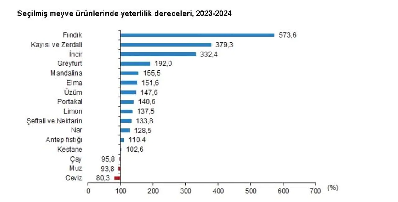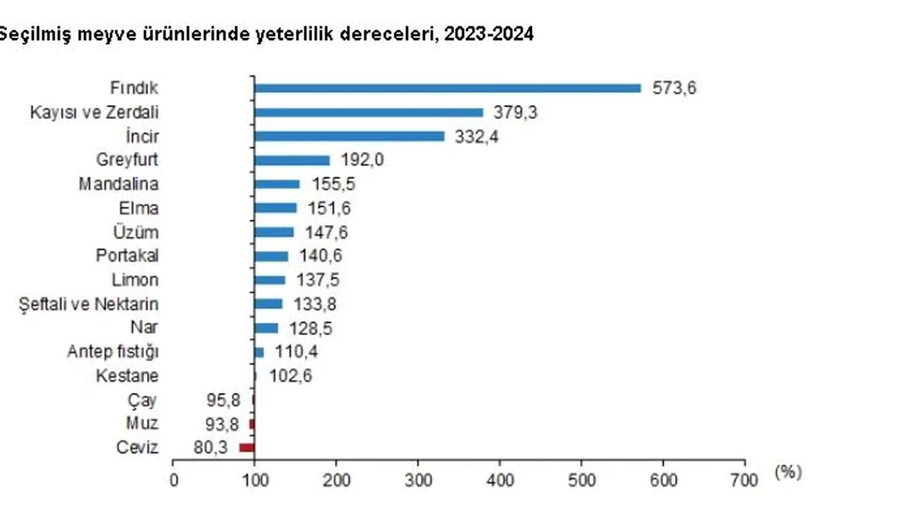 ANKARA, (DHA)- TÜRKİYE İstatistik Kurumu (TÜİK), 2024 yılında bitkisel ürünlerde yurt içi üretimin yurt içi talebi karşılama derecesi (yeterlilik derecesi) en yüksek ürünün, yüzde 573,6 ile fındık olduğunu açıkladı.