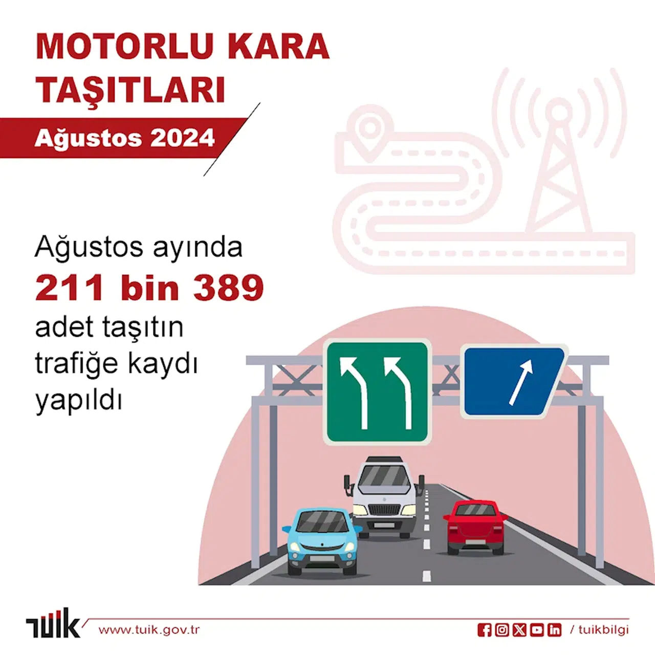 Ağustos ayında trafiğe kaydı yapılan taşıt sayısı bir önceki aya göre, yüzde 23,6 azaldı. Bir önceki aya göre, trafiğe kaydı yapılan taşıt sayısı otobüste yüzde 27,5, özel amaçlı taşıtta yüzde 20 artarken otomobilde yüzde 39,2, kamyonda yüzde 27,9, kamyonette yüzde 24,6, traktörde yüzde 18,9, minibüste yüzde 10,9 ve motosiklette yüzde 10,9 azaldı.