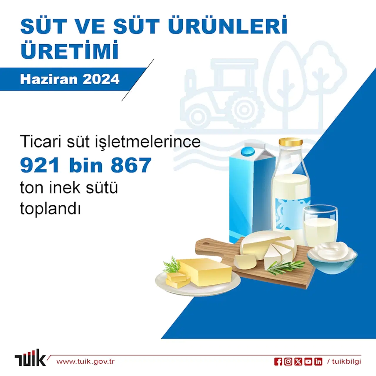 Haziranda ticari süt işletmeleri tarafından toplanan inek sütü miktarı bir önceki yılın aynı ayına göre yüzde 6,4 artarak 921 bin 867 ton oldu. İnek sütü miktarı, ocak-haziran döneminde ise bir önceki yılın aynı dönemine göre yüzde 8,1 arttı. Haziran ayında bir önceki yılın aynı ayına göre, inek peyniri üretimi yüzde 3, içme sütü üretimi yüzde 7,8 azalırken; ayran üretimi yüzde 9, yoğurt üretimi yüzde 10,1 ve tereyağı üretimi yüzde 3,6 arttı. Ocak-haziran döneminde ise bir önceki yılın aynı dönemine göre, inek peyniri üretimi yüzde 5,7, ayran üretimi yüzde 14,7, yoğurt üretimi yüzde 10, içme sütü üretimi yüzde 2,3, tereyağı üretimi yüzde 12,3 arttı. (DHA)