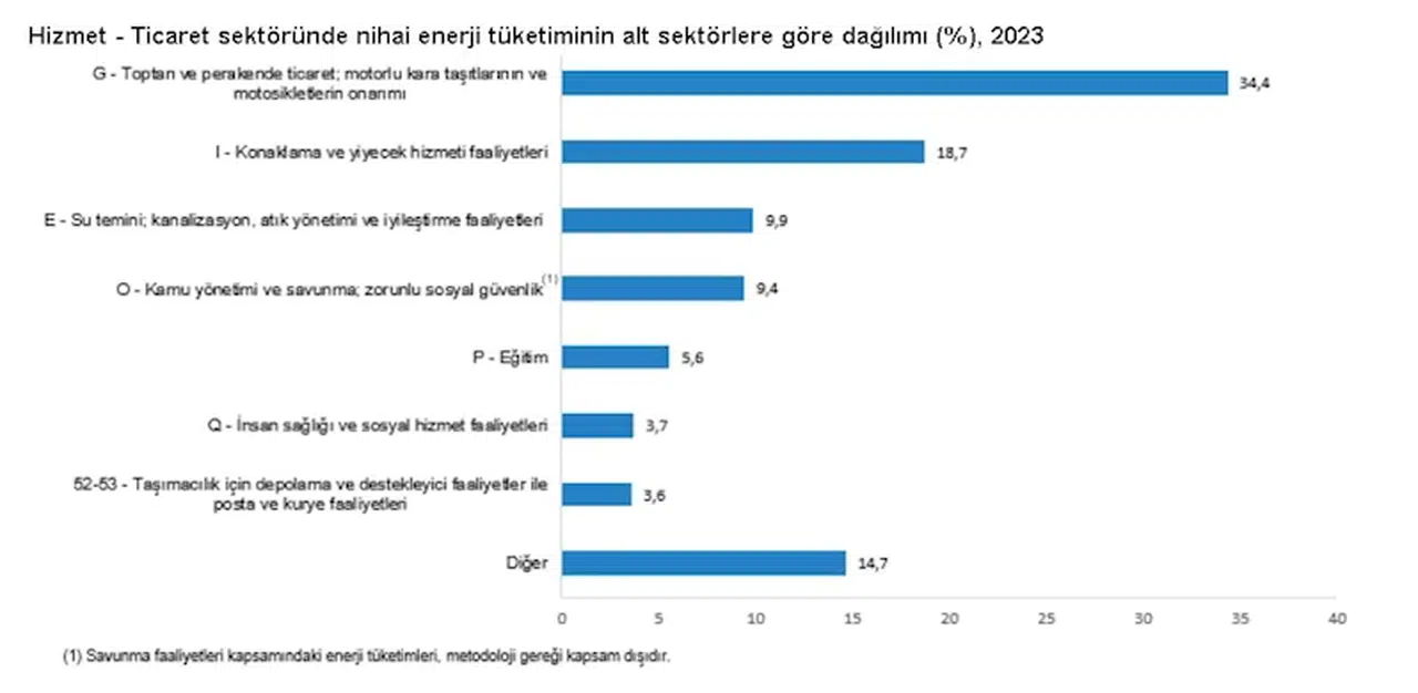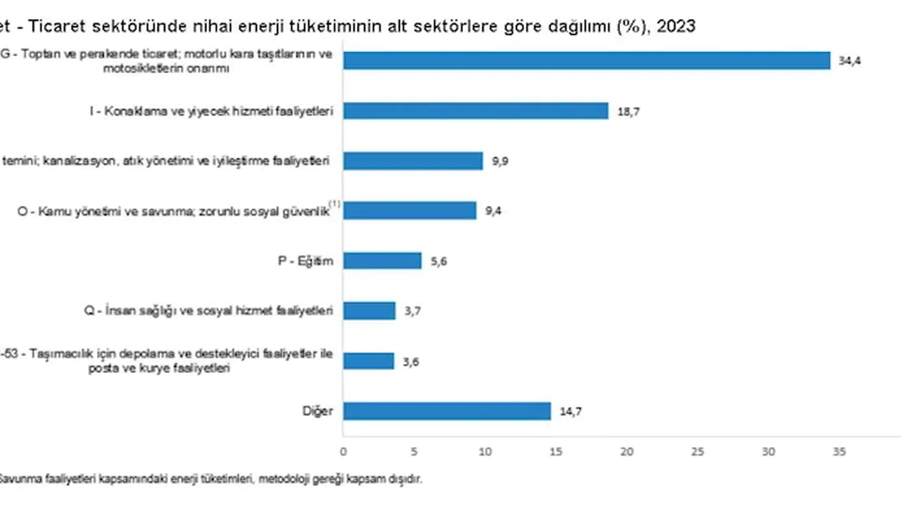 Buna göre; hizmet-ticaret sektöründe 2023 yılında toplam nihai enerji tüketimi 503 bin 682 terajul oldu. Alt sektörler itibarıyla nihai enerji tüketiminde en büyük payı, yüzde 34,4 ile 'toptan ve perakende ticaret; motorlu kara taşıtlarının ve motosikletlerin onarımı' sektörü aldı. Bu sektörü sırasıyla yüzde 18,7 ile 'konaklama ve yiyecek hizmeti faaliyetleri' ve yüzde 9,9 ile 'su temini; kanalizasyon, atık yönetimi ve iyileştirme faaliyetleri' sektörleri takip etti.