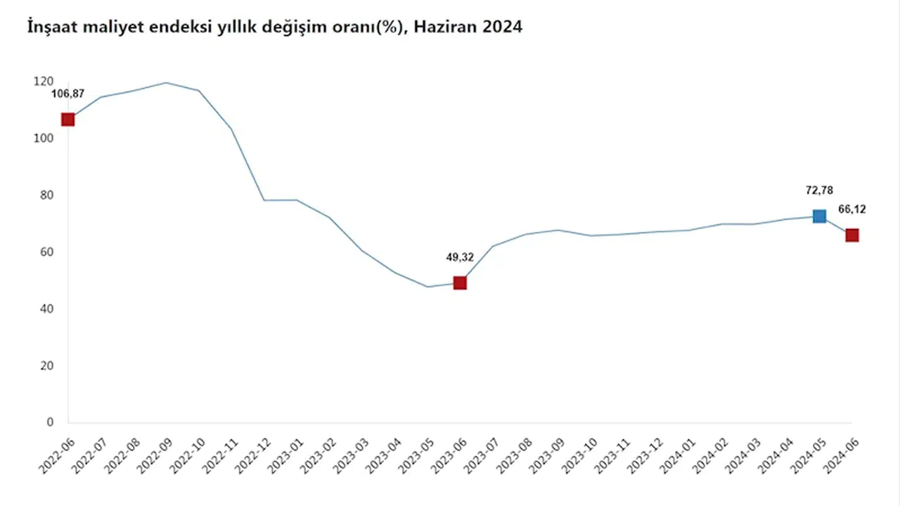 TÜİK, Haziran 2024 dönemine ilişkin inşaat maliyet endeksi verilerini açıkladı. Buna göre; inşaat maliyeti haziran ayında bir önceki aya göre yüzde 0,40, bir önceki yılın aynı ayına göre yüzde 66,12 arttı. Bir önceki aya göre, malzeme endeksi yüzde 1,01 arttı, işçilik endeksi ise yüzde 0,80 azaldı. Ayrıca bir önceki yılın aynı ayına göre, malzeme endeksi yüzde 51,55, işçilik endeksi yüzde 105,50 arttı.