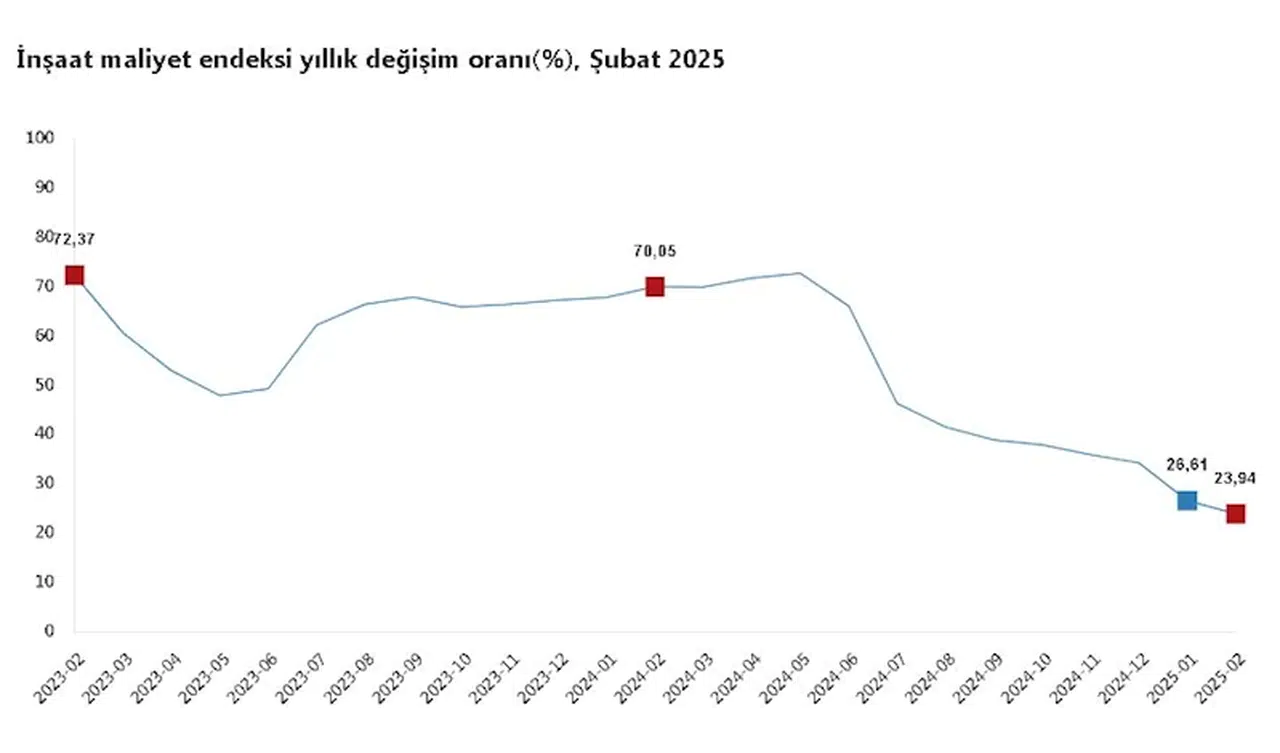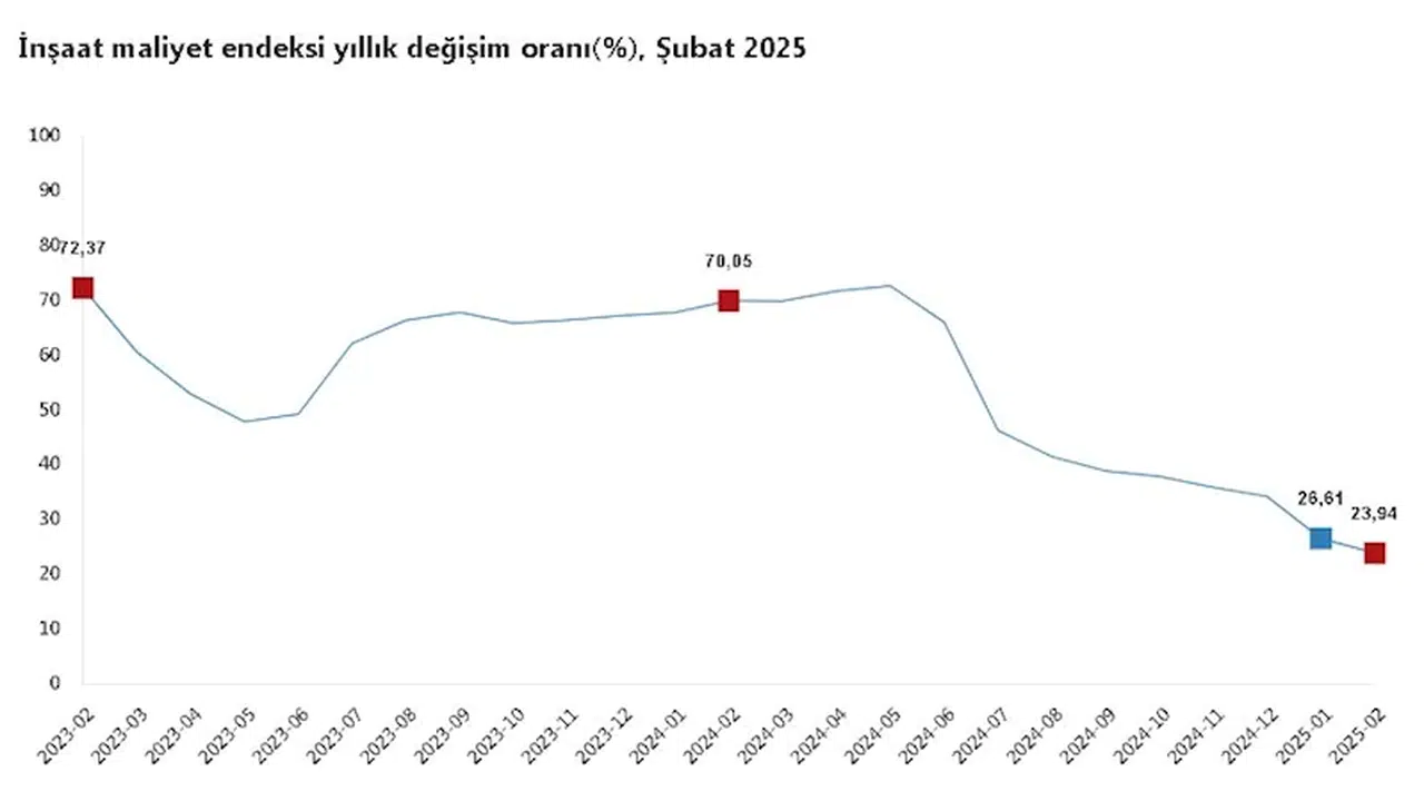 ANKARA, (DHA)- TÜRKİYE İstatistik Kurumu (TÜİK), şubat ayında inşaat maliyetinin yıllık yüzde 23,94, aylık yüzde 1,24 arttığını açıkladı.