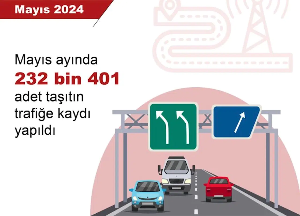Ocak-Mayıs 2024 döneminde bir önceki yılın aynı dönemine göre, trafiğe kaydı yapılan taşıt sayısı yüzde 23 artarak 1 milyon 62 bin 420 olurken; trafikten kaydı silinen taşıt sayısı yüzde 3,6 azalarak 11 bin 620 oldu. Böylece ocak-mayıs döneminde trafikteki toplam taşıt sayısında 1 milyon 50 bin 800 artış gerçekleşti.