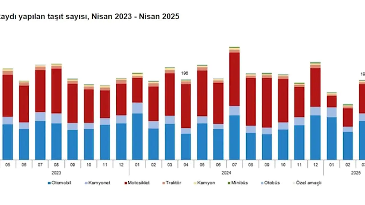 TÜİK, Nisan 2025 dönemine ilişkin motorlu kara taşıtları istatistiklerini açıkladı. Buna göre; nisan ayında 191 bin 983 taşıtın trafiğe kaydı yapıldı. Bu taşıtların yüzde 43,5'ini motosiklet, yüzde 41,9'unu otomobil, yüzde 9'unu kamyonet, yüzde 2,7'sini traktör, yüzde 1,7'sini kamyon, yüzde 0,8'ini minibüs, yüzde 0,3'ünü otobüs ve yüzde 0,1'ini özel amaçlı taşıtlar oluşturdu. Nisanda trafiğe kaydı yapılan taşıt sayısı bir önceki aya göre; motosiklette yüzde 18, traktörde yüzde 6,7, minibüste yüzde 0,7 artarken; otobüste yüzde 23,7, otomobilde yüzde 15,3, kamyonda yüzde 9,7, özel amaçlı taşıtta yüzde 9,3 ve kamyonette yüzde 8,7 azaldı.