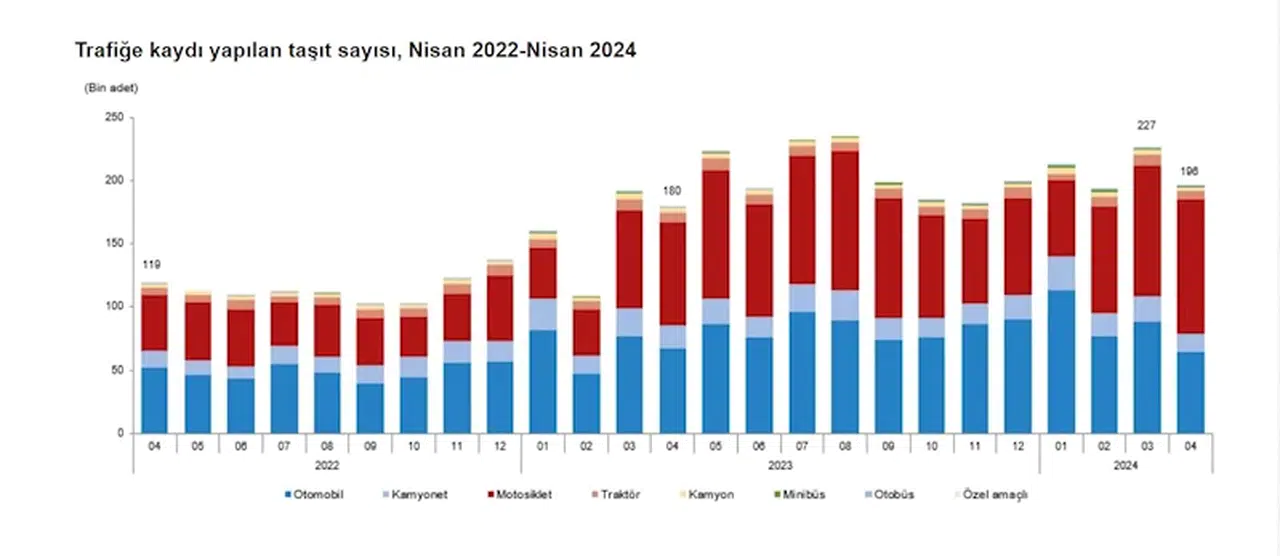 TÜİK, Nisan 2024 dönemine ilişkin motorlu kara taşıtları istatistiklerini açıkladı. Buna göre; nisan ayında 196 bin 309 adet taşıtın trafiğe kaydı yapıldı. Bu taşıtların yüzde 54,3'ünü motosiklet, yüzde 32,9'unu otomobil, yüzde 7,1'ini kamyonet, yüzde 3,2'sini traktör, yüzde 1,6'sını kamyon, yüzde 0,5'ini minibüs, yüzde 0,3'ünü otobüs ve yüzde 0,1'ini özel amaçlı taşıtlar oluşturdu. Trafiğe kaydı yapılan taşıt sayısı geçen yılın aynı ayına göre yüzde 9,4 artarken, bir önceki aya göre yüzde 13,4 azaldı.