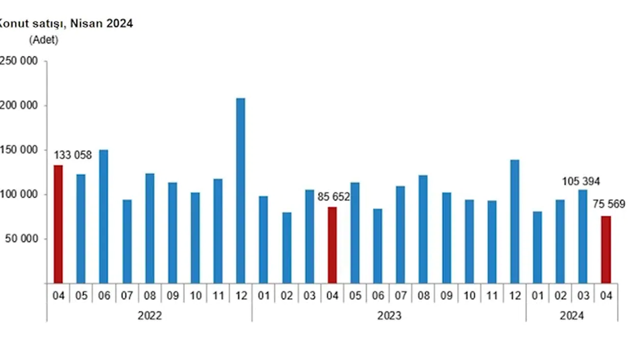 TÜİK, Nisan 2024 dönemine ilişkin konut satış istatistiklerini açıkladı. Buna göre; Türkiye genelinde konut satış sayısı, nisan ayında bir önceki yılın aynı ayına göre yüzde 11,8 azalarak 75 bin 569 oldu. Konut satış sayısının en fazla olduğu iller sırasıyla 12 bin 406 ile İstanbul, 6 bin 272 ile Ankara ve 4 bin 427 ile Antalya olurken, en az olduğu iller sırasıyla 18 ile Ardahan, 35 ile Hakkari ve 49 ile Tunceli oldu.