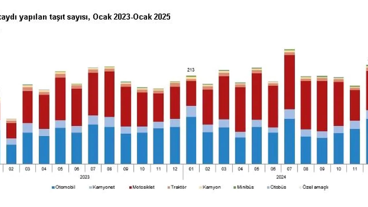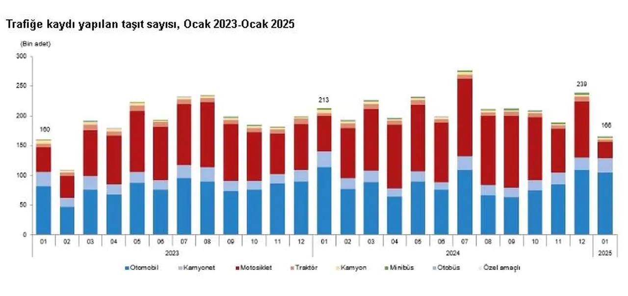 TÜİK, Ocak 2025 dönemine ilişkin motorlu kara taşıtları istatistiklerini açıkladı. Buna göre; ocak ayında trafiğe kaydı yapılan taşıt sayısı bir önceki aya göre yüzde 30,7, bir önceki yılın aynı ayına göre yüzde 22,4 azalışla 165 bin 734 oldu. Trafiğe kaydı yapılan taşıtların yüzde 62,9'unu otomobil, yüzde 16,7'sini motosiklet, yüzde 14,7'sini kamyonet, yüzde 2,3'ünü kamyon, yüzde 1,9'unu traktör, yüzde 1'ini minibüs, yüzde 0,4'ünü otobüs ve yüzde 0,1'ini özel amaçlı taşıtlar oluşturdu.