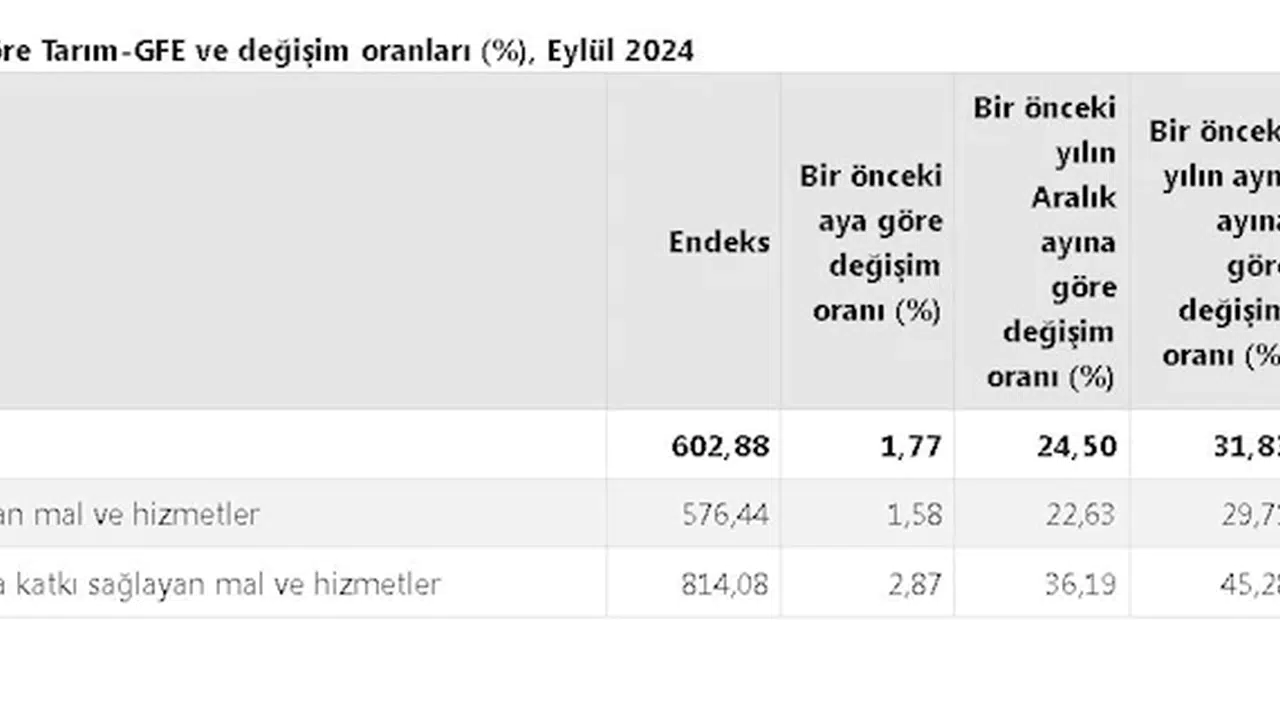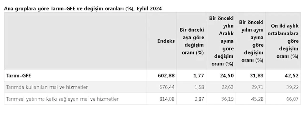 TÜİK, Eylül 2024 dönemine ilişkin tarımsal girdi fiyat endeksini açıkladı. Buna göre; tarımsal girdi fiyatları bir önceki aya göre yüzde 1,77, bir önceki yılın aralık ayına göre yüzde 24,50, bir önceki yılın aynı ayına göre yüzde 31,83 artış ve 12 aylık ortalamalara göre yüzde 42,52 arttı.