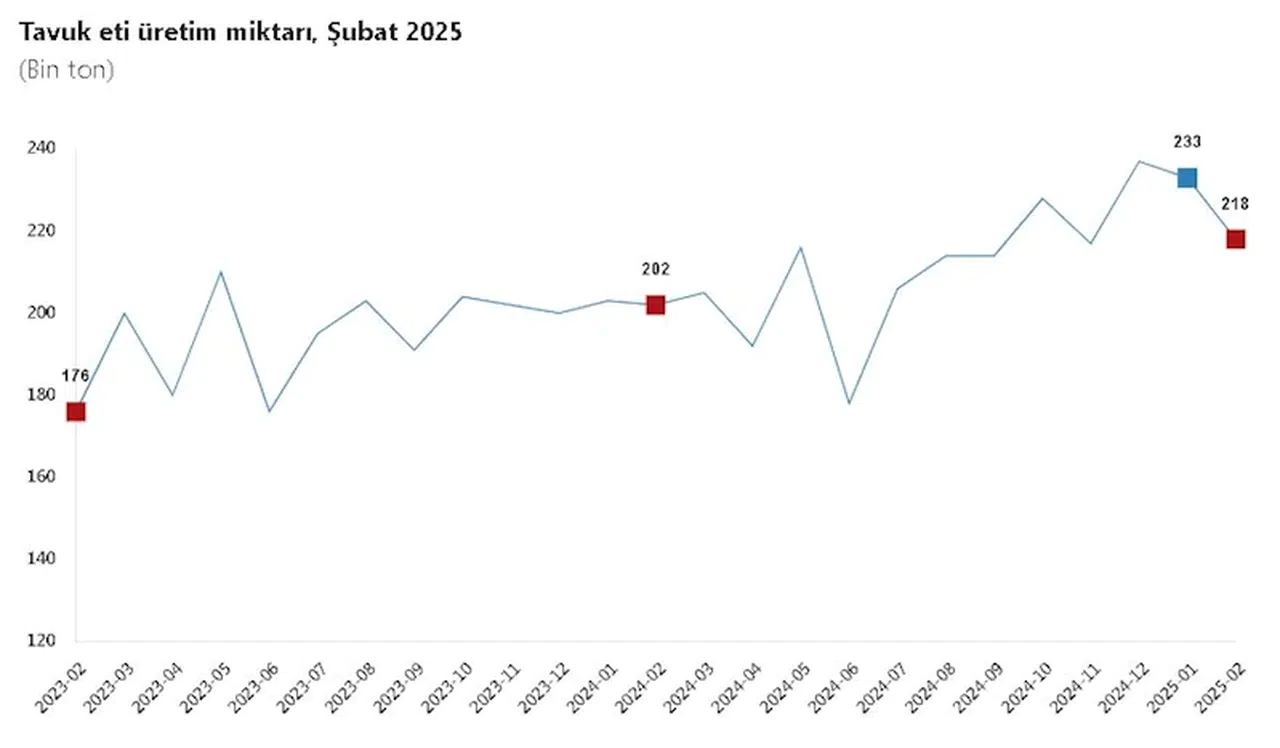 TÜİK, Şubat 2025 dönemine ilişkin kümes hayvancılığı ile süt ve süt ürünleri üretimi verilerini açıkladı. Buna göre; bir önceki aya göre tavuk eti üretimi yüzde 6,4 oranında azalarak 218 bin 260 ton, tavuk yumurtası üretimi de yüzde 6,4 oranında azalarak 1 milyar 547 milyon 93 bin adet oldu. Bir önceki yılın aynı ayına göre ise tavuk yumurtası üretimi yüzde 10,8 azaldı, kesilen tavuk sayısı yüzde 5,8 arttı, tavuk eti üretimi yüzde 8,2 arttı. Ocak-şubat döneminde bir önceki yılın aynı dönemine göre, tavuk yumurtası üretimi yüzde 10,4 azaldı, kesilen tavuk sayısı yüzde 8,8 arttı, tavuk eti üretimi yüzde 11,5 arttı.