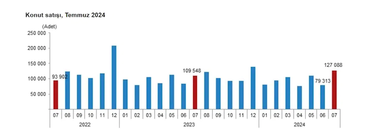 TÜİK, Temmuz 2024 dönemine ilişkin konut satış istatistiklerini açıkladı. Buna göre; Türkiye genelinde konut satışları temmuz ayında bir önceki yılın aynı ayına göre, yüzde 16 artarak 127 bin 88 oldu. Konut satış sayısının en fazla olduğu iller sırasıyla 19 bin 47 ile İstanbul, 11 bin 364 ile Ankara ve 6 bin 659 ile Antalya olurken, en az olduğu iller sırasıyla 61 ile Ardahan, 64 ile Hakkari ve 77 ile Bayburt oldu. Konut satışları ocak-temmuz döneminde bir önceki yılın aynı dönemine göre yüzde 0,5 azalışla 672 bin 162 olarak gerçekleşti.