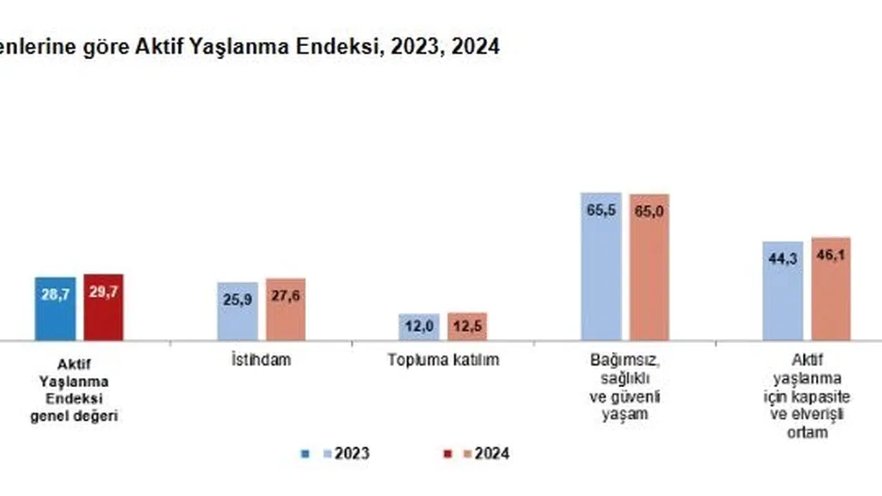 ANKARA, (DHA)- TÜRKİYE İstatistik Kurumu (TÜİK), yaşlı nüfusun yaşlılık sürecini ne kadar etkin geçirdiğinin tespiti adına geliştirilen Aktif Yaşlanma Endeksi (AYE) verilerini ilk kez açıkladı. Türkiye'nin AYE genel endeks değeri 2023 yılında 28,7 iken 2024'te 29,7 oldu.