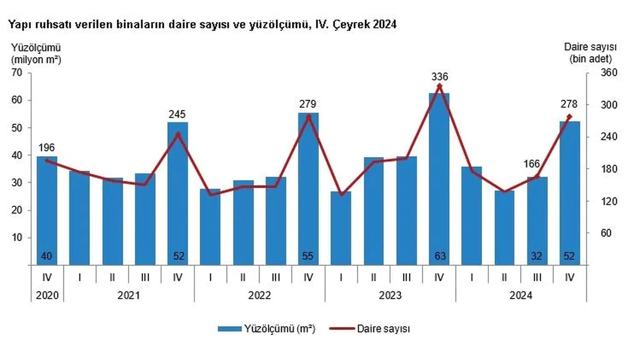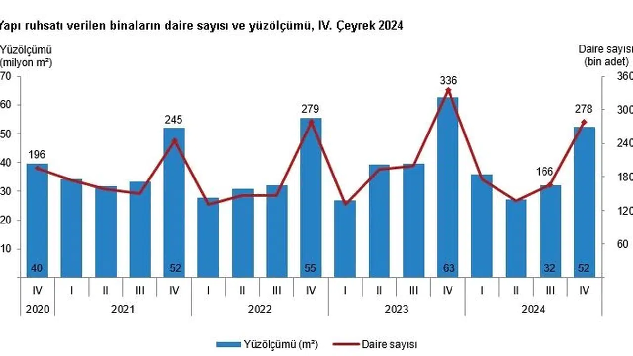 TÜİK, 2024 yılı 4'üncü çeyreğine ilişkin yapı izin istatistiklerini açıkladı. Bir önceki yılın aynı çeyreğine göre, belediyeler tarafından yapı ruhsatı verilen bina sayısı yüzde 16,7, daire sayısı yüzde 17,4 ve yüz ölçümü yüzde 16,5 azaldı. Belediyeler tarafından yapı ruhsatı verilen binaların toplam yüz ölçümü 52,4 milyon metrekare olurken; bunun 28,4 milyon metrekaresi konut, 12,1 milyon metrekaresi konut dışı ve 11,9 milyon metrekaresi ortak kullanım alanı olarak gerçekleşti. Belediyeler tarafından yapı ruhsatı verilen binaların kullanma amacına göre en yüksek yüz ölçümü payına 36,6 milyon metrekare ile 2 ve daha fazla daireli ikamet amaçlı binalar sahip oldu. Bunu 4 milyon metrekare ile sanayi binaları ve depolar izledi.