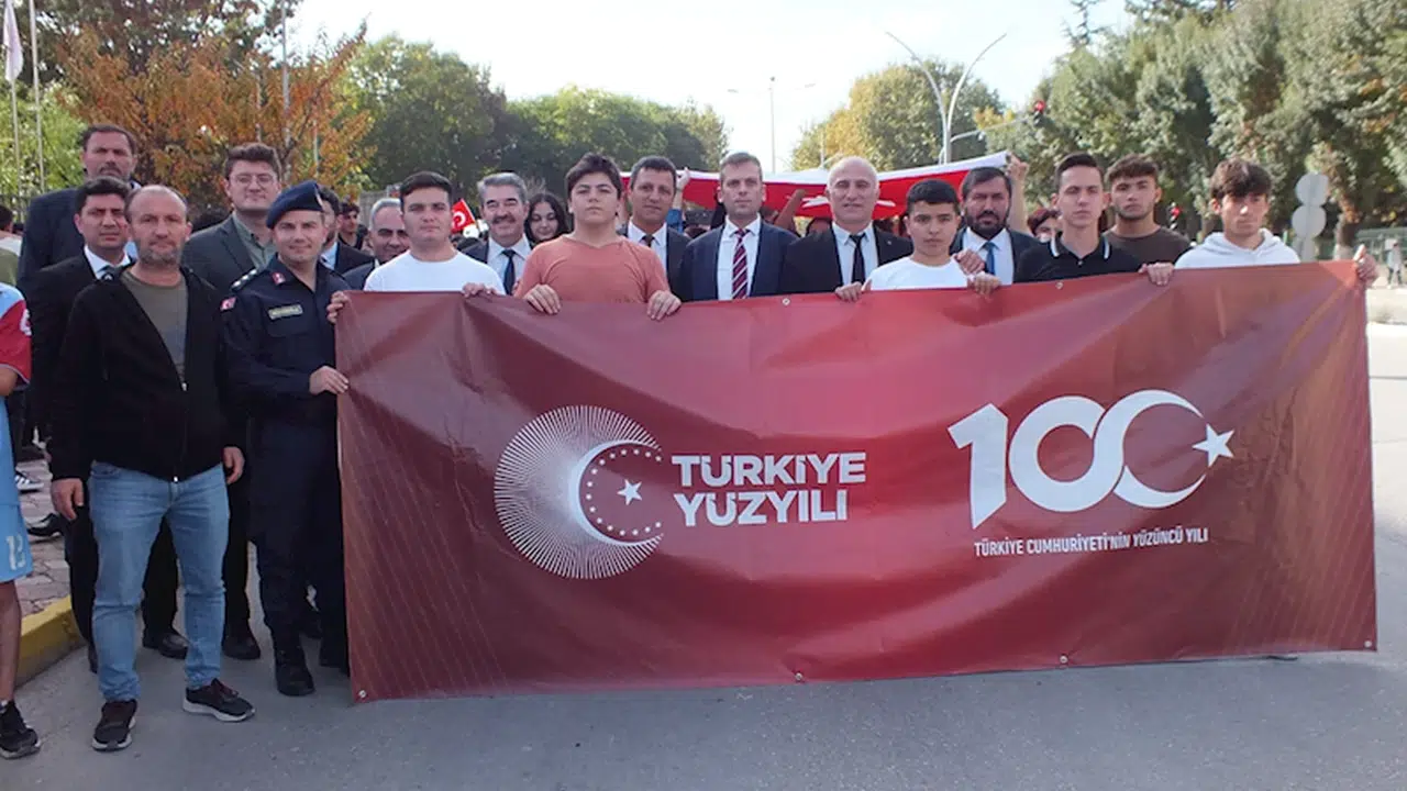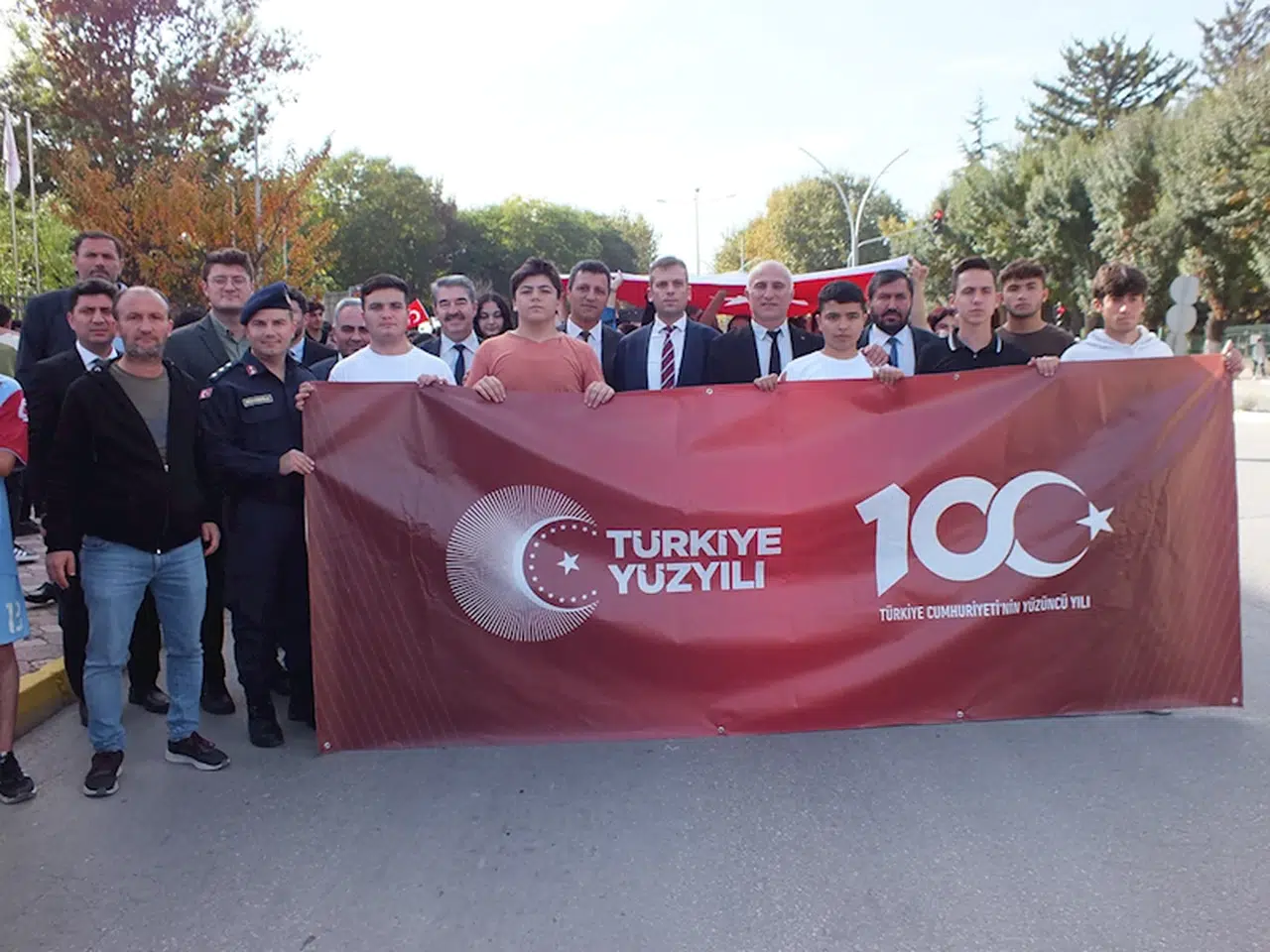Mehmet Uzun Spor Salonu önünde toplanan öğrenciler, ellerindeki Türk bayrakları ile Cumhuriyet Caddesi'nden yürürken, sporcular da Cumhuriyet Meydanı'na kadar koştu.