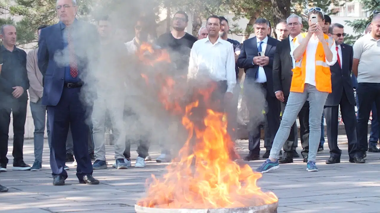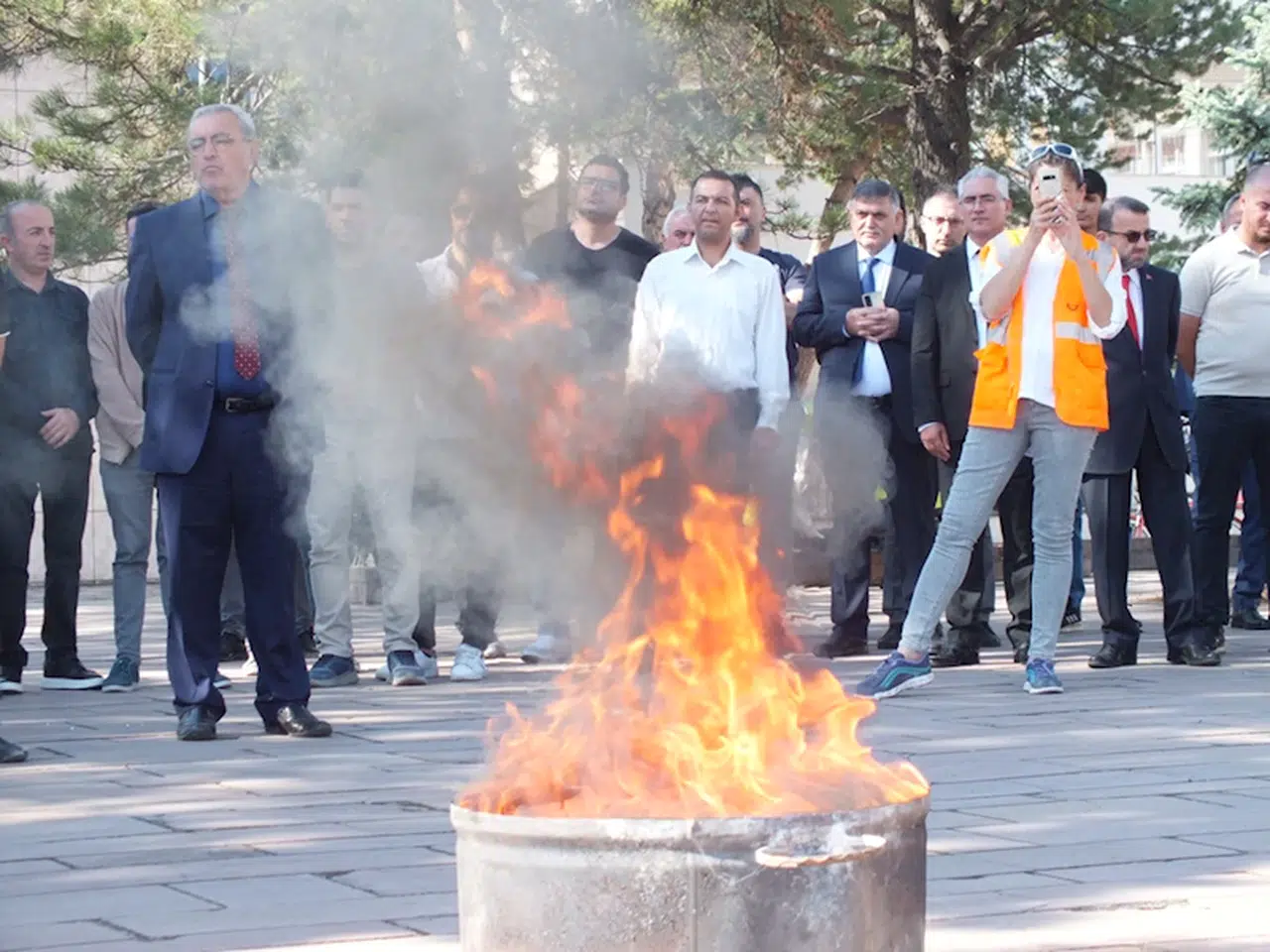 Cumhuriyet Meydanı'nda gerçekleştirilen tatbikatta ise yangın söndürme tüpü ile alevlere nasıl müdahale edileceği hakkında çalışanlara uygulamalı olarak bilgi verildi.