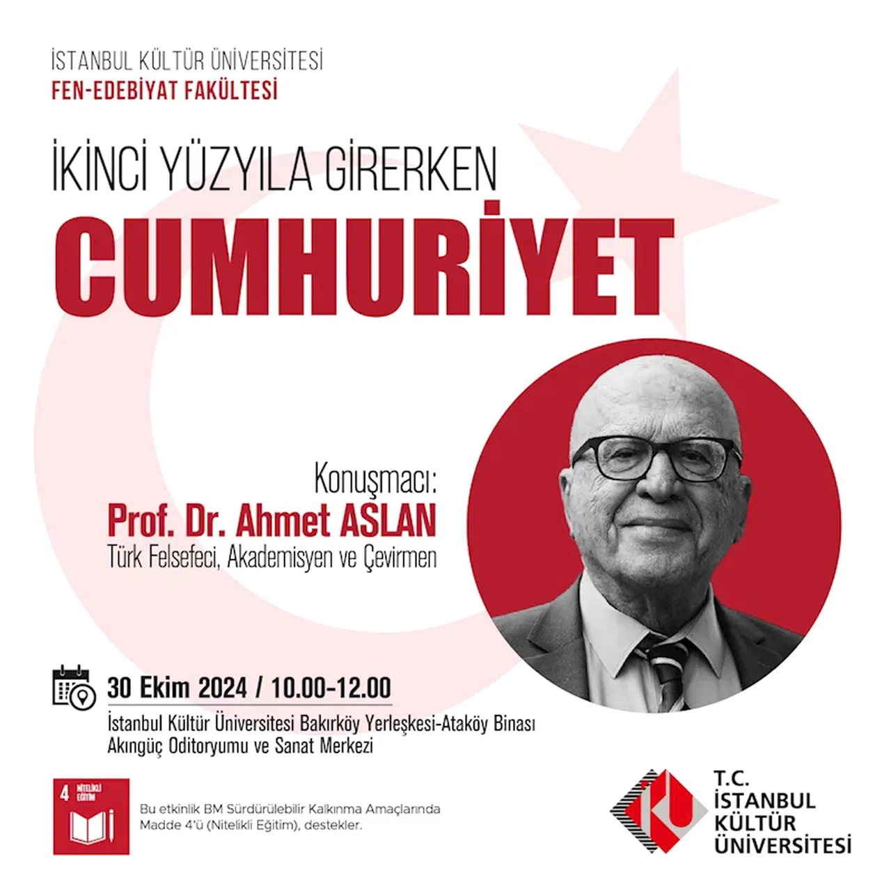 İSTANBUL,(DHA) - TÜRK felsefeci, akademisyen ve çevirmen Prof. Dr. Ahmet Aslan, 30 Ekim'de Cumhuriyetin 101'inci Yılı Özel Buluşmasında İstanbul Kültür Üniversitesi'nin Fen-Edebiyat Fakültesi'nin konuğu olacak.