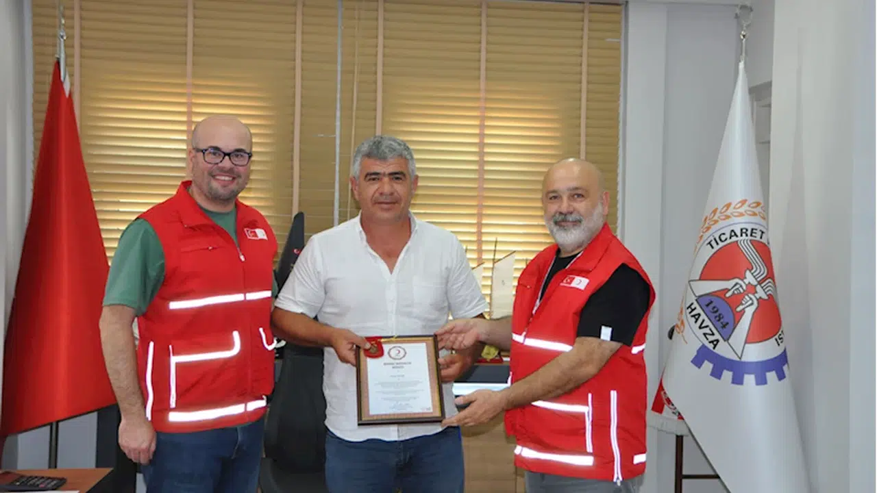 Acar’a bronz madalya ve beratı, Kızılay kan bağışçısı kazanım uzmanı Alper Candan ve Murat Bozdemir tarafından Havza TSO binasında sunuldu.