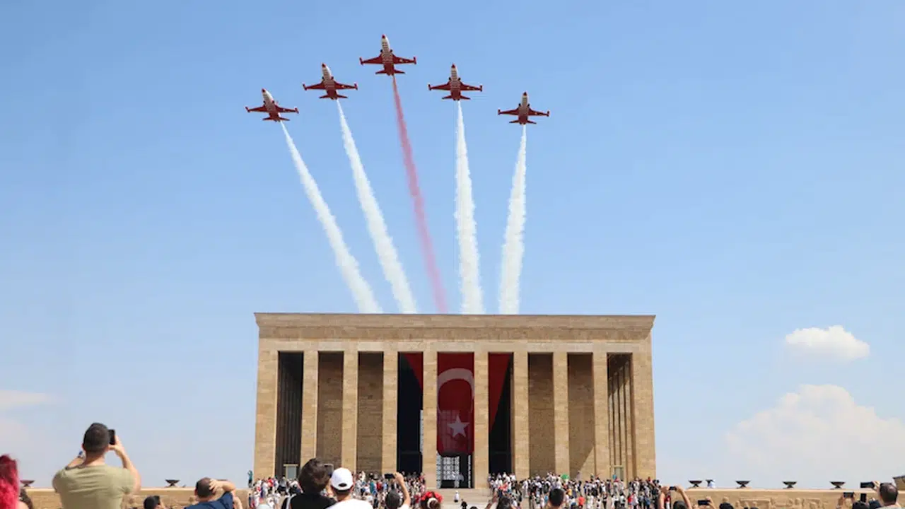 30 Ağustos Zafer Bayramı kutlamaları kapsamında Türk Yıldızları da Anıtkabir üzerinde saygı uçuşu yaptı. Anıtkabir'in üzerinde manevralar yapan Türk Yıldızları, izleyenlere heyecan dolu anlar yaşattı. Özellikle çocukların büyük ilgi gösterdiği gösteri uçuşunda pilotlar akrobatik hareketlere imza attı. Anıtkabir, Zafer Bayramı nedeniyle bugün saat 22.00'ye kadar ziyarete açık olacak. (DHA)