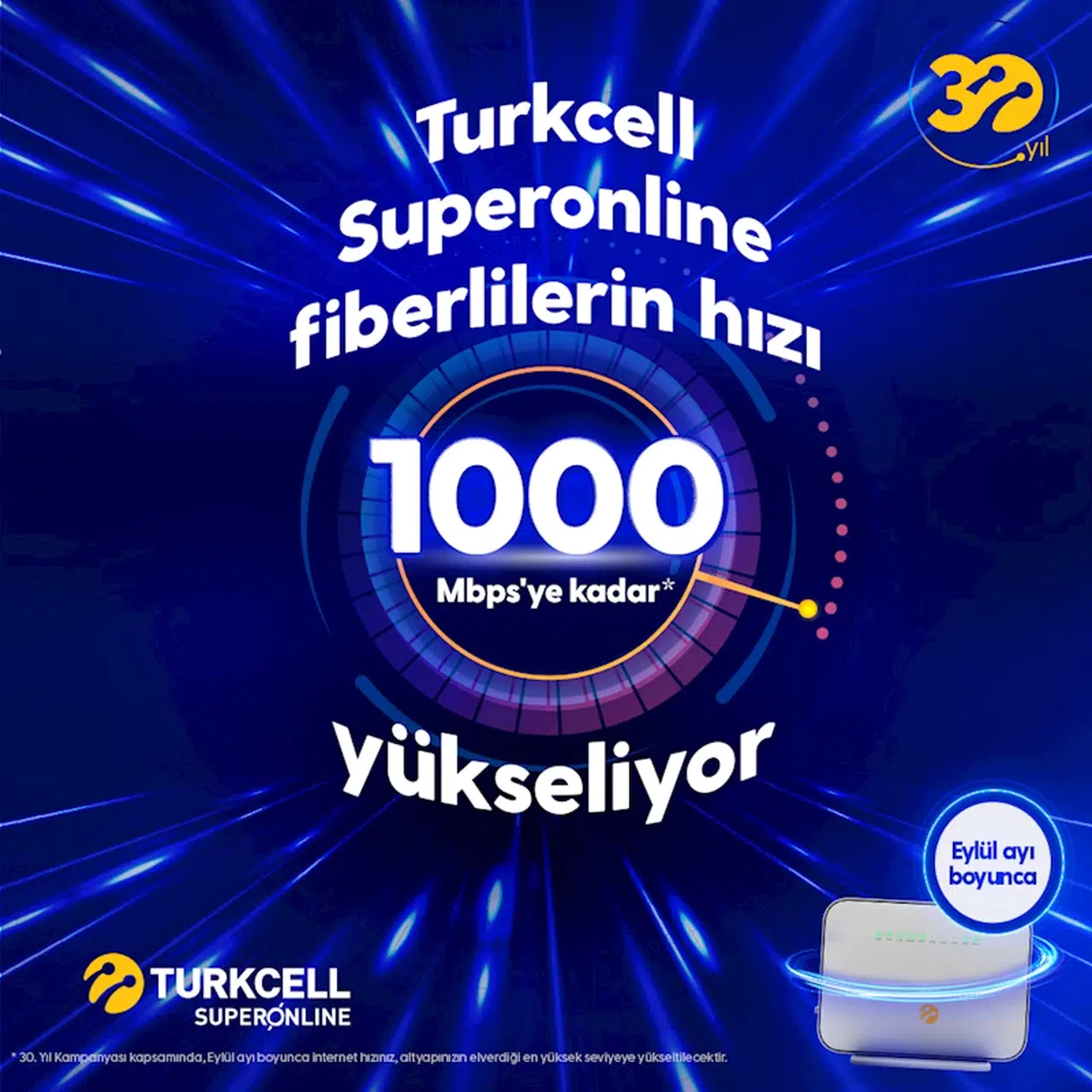 Turkcell, 30’uncu yılında fiber altyapısından yararlanan yaklaşık 2,3 milyon Turkcell Superonline abonesinin internet paket hızını, eylül ayı boyunca altyapısının uygun olduğu en yüksek seviyeye ücretsiz olarak yükseltiyor. Hız yükseltme için Turkcell Superonline fiber abonelerinin herhangi bir işlem yapması gerekmeyecek. İnternet hızı 1 ay süreyle, ücretsiz şekilde tarife değişmeden altyapının desteklemesi durumunda 1000 mbps’ye kadar otomatik olarak yükselecek.