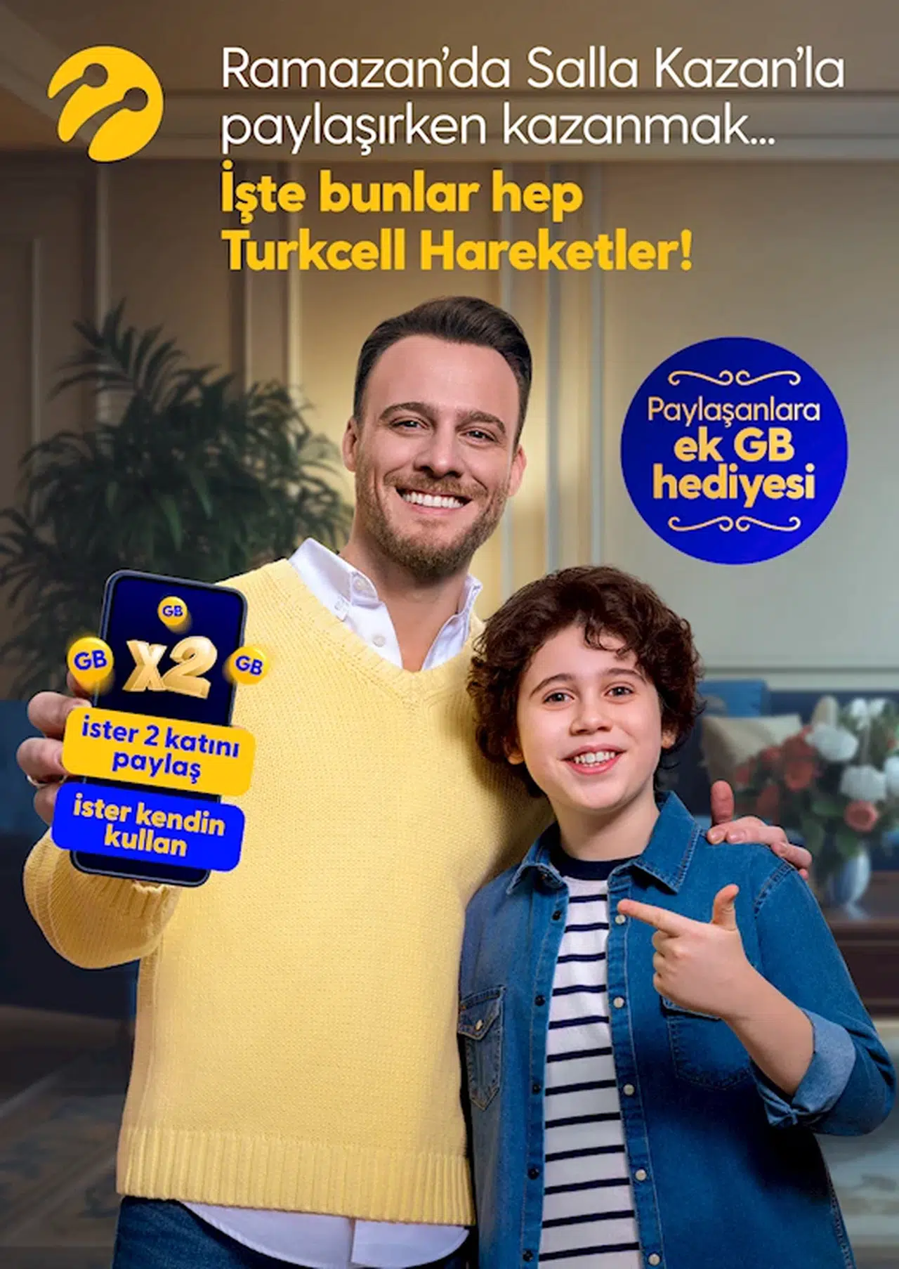 İSTANBUL, (DHA) TURKCELL, Ramazan geleneği haline getirdiği 'Salla Kazan' kampanyasına bu sene de devam ediyor. Ramazanda Salla Kazan kampanyasından toplamda 100 milyon GB hediye edecek olan Turkcell, bu seneki kampanyasına paylaşmanın önemini vurgulamak için bir yenilik getirdi. Buna göre; kullanıcılar kazandıkları GB'ları kendileri kullanabildikleri gibi, isterlerse sevdikleriyle ikiye katlayarak paylaşabiliyor. Kazandıkları GB'ları paylaşanlara ek 'Salla Kazan' yapma hakkı da veriliyor.