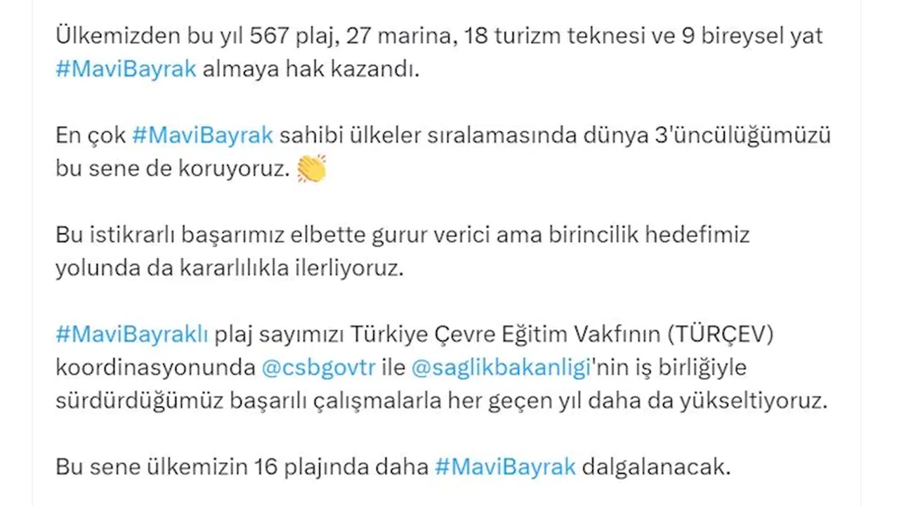 Bakan Ersoy, sosyal medya hesabından yaptığı açıklamada, "Mavi bayrak plajlarımıza çok yakışıyor. Ülkemizden bu yıl 567 plaj, 27 marina, 18 turizm teknesi ve 9 bireysel yat mavi bayrak almaya hak kazandı. En çok mavi bayrak sahibi ülkeler sıralamasında dünya 3'üncülüğümüzü bu sene de koruyoruz. Bu istikrarlı başarımız elbette gurur verici ama birincilik hedefimiz yolunda da kararlılıkla ilerliyoruz. Mavi bayraklı plaj sayımızı Türkiye Çevre Eğitim Vakfı’nın (TÜRÇEV) koordinasyonunda Çevre, Şehircilik ve İklim Değişikliği Bakanlığı ile Sağlık Bakanlığı'nın iş birliğiyle sürdürdüğümüz başarılı çalışmalarla her geçen yıl daha da yükseltiyoruz. Bu sene ülkemizin 16 plajında daha mavi bayrak dalgalanacak. Hayırlı olsun" ifadelerini kullandı.