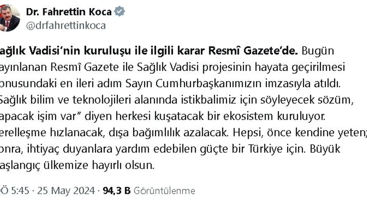 Bakan Koca, konuya ilişkin sosyal medya hesabından yaptığı açıklamada, "Sağlık Vadisi'nin kuruluşu ile ilgili karar Resmi Gazete'de. Bugün yayınlanan Resmi Gazete ile Sağlık Vadisi projesinin hayata geçirilmesi konusundaki en ileri adım Sayın Cumhurbaşkanımızın imzasıyla atıldı. 'Sağlık bilim ve teknolojileri alanında istikbalimiz için söyleyecek sözüm, yapacak işim var' diyen herkesi kuşatacak bir ekosistem kuruluyor. Yerelleşme hızlanacak, dışa bağımlılık azalacak. Hepsi, önce kendine yeten; sonra, ihtiyaç duyanlara yardım edebilen güçte bir Türkiye için. Büyük başlangıç ülkemize hayırlı olsun" ifadelerini kullandı. (DHA)