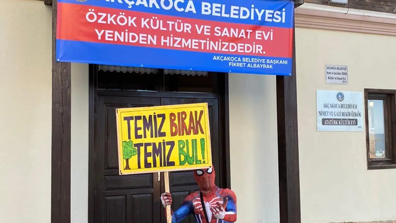 DÜZCE (AA) - Türkiye'yi gezme hayaliyle memleketi İzmir'den "Örümcek Adam" kostümüyle yola çıkan Salih Ayaz Koç, Düzce'nin Akçakoca ilçesinde sahil temizliği etkinliğine katıldı.