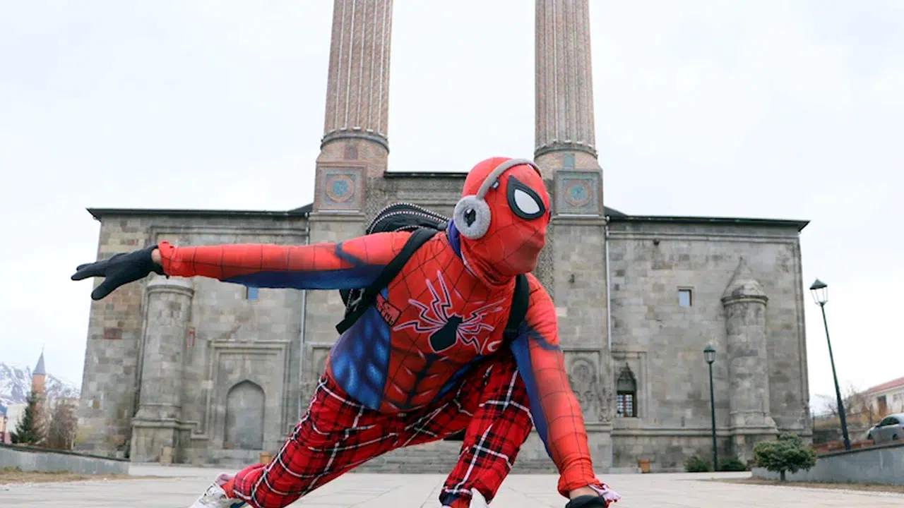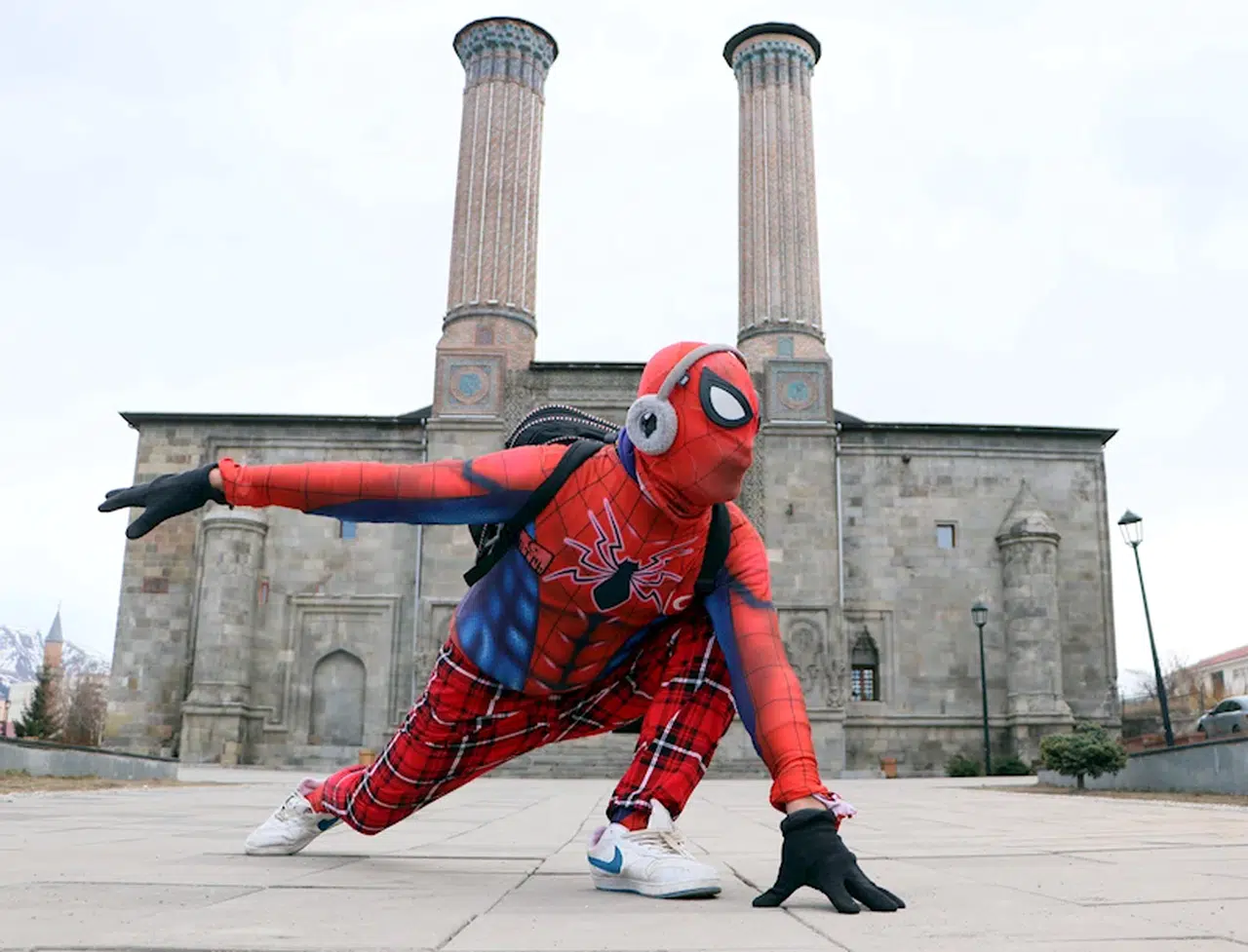 İzmir'de yaşayan Ayaz Salih Koç, 6 Şubat depremlerinin ardından gönüllü olarak bölgeye gitti. Yanında götürdüğü 'Örümcek Adam' kostümüyle çocukları eğlendiren Koç, bölgedeki depremzedelere yönelik yardım faaliyetlerinde yer aldı. Deprem bölgesinde yaşadığı olay sonrası giydiği pijama nedeniyle 'Yerli Pijamalı Örümcek Adam' olarak anılmaya başlayan Koç, bölgeden ayrıldıktan sonra da Türkiye'yi dolaşmaya karar verdi. Otostopla 1 yılı aşkın süredir Türkiye'yi dolaşan ve gittiği yerleri sosyal medyada paylaşımlar yaparak tanıtmaya çalışan Ayaz Salih Koç, bugüne kadar 62 ili dolaştı. Koç, 63'üncü şehir olarak geldiği Erzurum'da, tarihi Çifte Minareli Medrese, Ulu Camii ve Erzurum Kalesi'nin bulunduğu Cumhuriyet Caddesi'nde kendine özgü hareketler yaparak özellikle çocukları eğlendirdi. Yanına gelenlere çantasında taşıdığı 'Örümcek Adam' maskotu ve anahtarlığını hediye ederek fotoğraf çektirdi. (DHA)