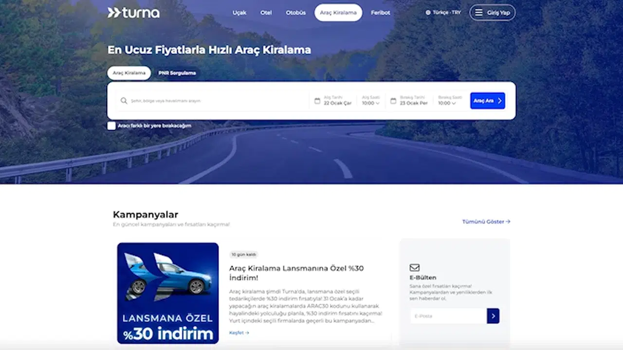 İSTANBUL,(DHA)- ÇEVRİM İÇİ seyahat platformu Turna.com, uçak, otobüs, feribot bileti ve otel rezervasyonu kategorilerine ek olarak araç kiralama hizmeti de sunmaya başladığını duyurdu.