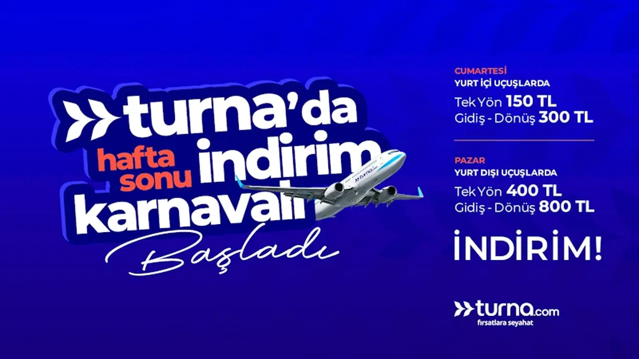 Uçak, otobüs ve feribot gibi farklı seyahat araçlarını tek çatı altında toplayan Turna.com, eylül ayını yeni bir indirim kampanyasıyla kapatıyor. 'Hafta Sonu İndirim Karnavalı' ile hem uçak biletlerinde hem yurt içi hem de yurt dışı yolcuları 150 TL'den 800'TL'ye kadar indirimli uçabilecek.