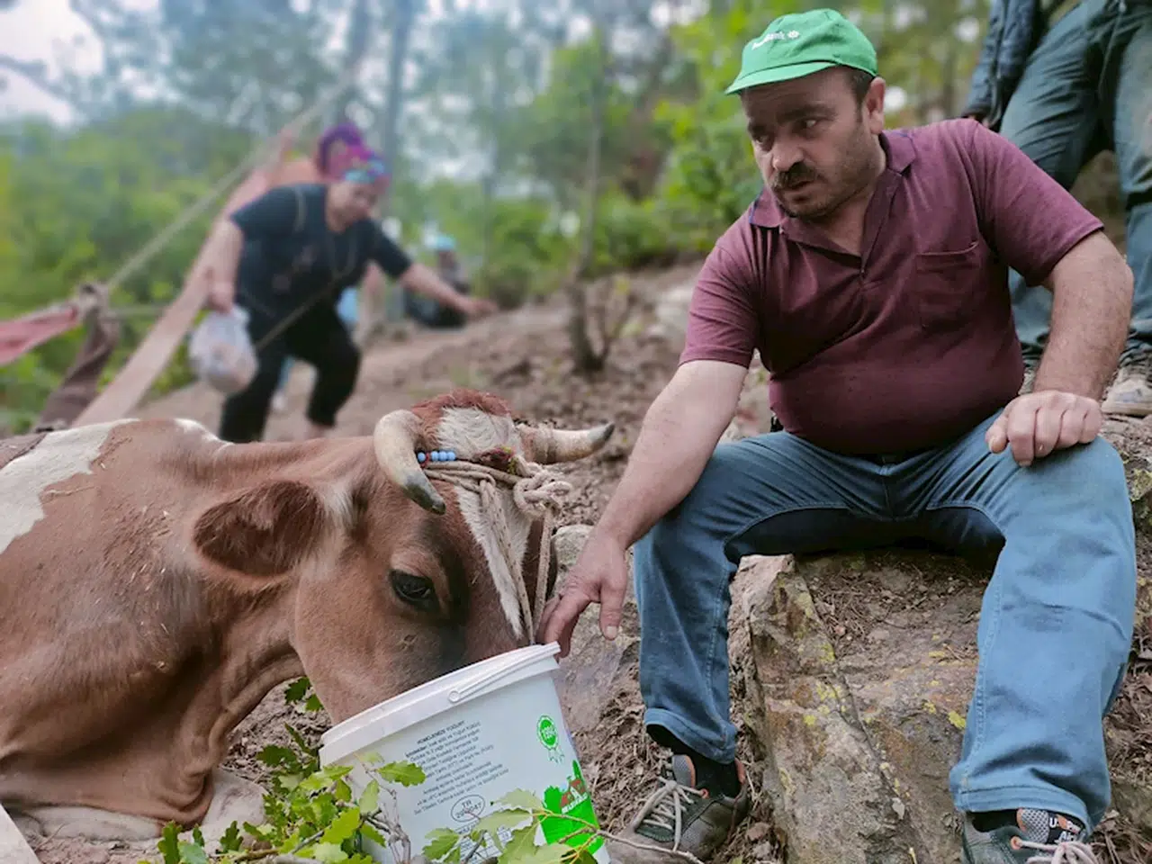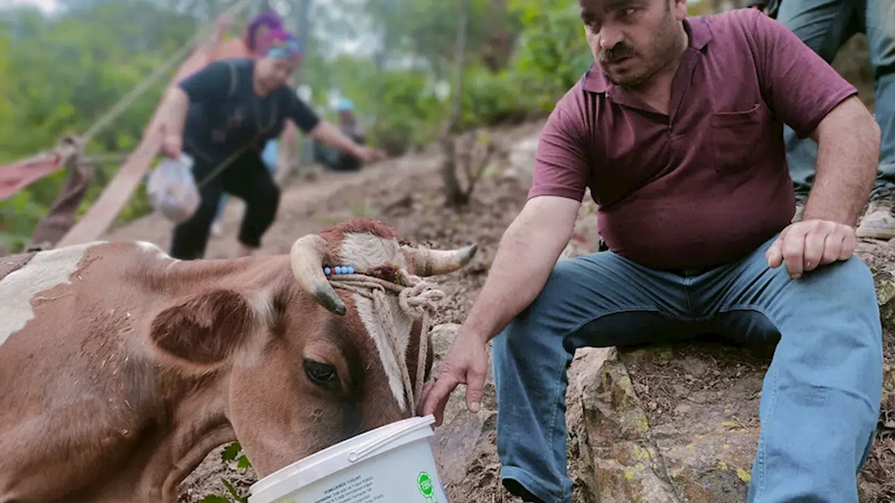 Gümüşhane’nin Torul ilçesi Soğuksu Mahallesi’nde yaşayan Celal Bostan'a ait inek, 2 gün önce yol kenarında otlatılırken dengesini kaybedip düştüğü yaklaşık 200 metrelik uçurumda mahsur kaldı. Yetkililerden yardım isteyen Bostan'ın ihbarıyla adrese AFAD ve itfaiye ekipleri sevk edildi. Adrese ulaşan ekipler, uçurumdaki ineğin kurtarılması için başlattığı çalışmadan sonuç alamadı. Uçurumdaki inek için yamaçta set oluşturularak güvenlik önlemi alındı. Mahsur kalan ineğin başında nöbet tutan sahibi yamaca taşıdığı otlarla hayvanını beslerken, kurtarılmasını bekliyor.