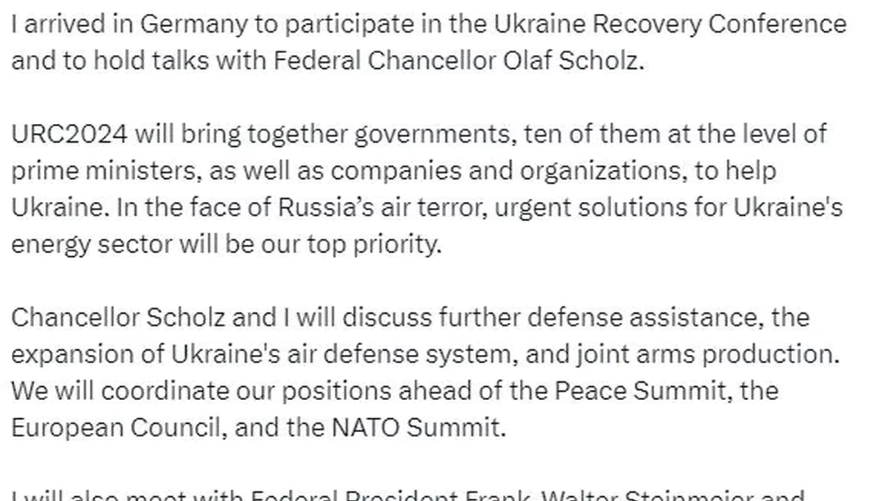 Ukrayna Devlet Başkanı Zelenski, yaptığı açıklamada, “Ukrayna Kurtarma Konferansına katılmak ve Federal Şansölye Olaf Scholz ile görüşmelerde bulunmak üzere Almanya'ya geldim. URC 2024, Ukrayna'ya yardım etmek üzere on tanesi başbakan düzeyinde olmak üzere hükümetleri, şirketleri ve kuruluşları bir araya getirecek. Rusya'nın hava terörü karşısında Ukrayna'nın enerji sektörüne yönelik acil çözümler en önemli önceliğimiz olacaktır. Şansölye Scholz ve ben daha fazla savunma yardımı, Ukrayna'nın hava savunma sisteminin genişletilmesi ve ortak silah üretimi konularını ele alacağız. Barış Zirvesi, Avrupa Konseyi ve NATO Zirvesi öncesinde pozisyonlarımızı koordine edeceğiz. Ayrıca Federal Cumhurbaşkanı Frank-Walter Steinmeier ve Federal Meclis Başkanı Barbel Bas ile görüşecek ve askerlerimizin eğitim gördüğü bir askeri üssü ziyaret edeceğim” dedi.