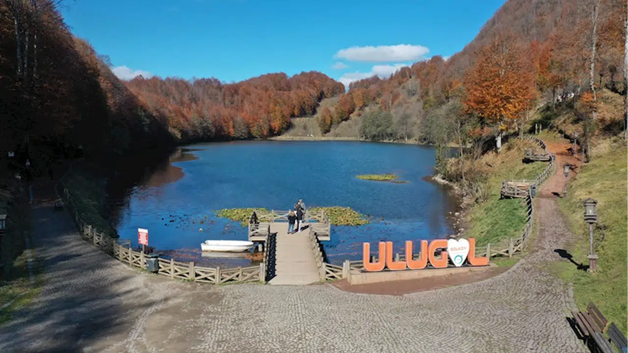 Türkiye'nin 36. tabiat parkı olma özelliğini taşıyan Ulugöl'e gelen ziyaretçiler, sarı, yeşil ve kırmızı tonlarındaki ağaçların arasında yürüyerek vakit geçiriyor.