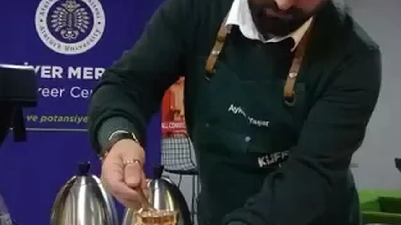 ERZURUM Atatürk Üniversitesi Kariyer Merkezi'nde öğrencilere uygulamalı kahve demleme eğitimi verildi. Barista eğitmeni Aykut Yaşar, Türk kahvesi demlemenin püf noktalarını anlattığı öğrencilere nasıl içileceğini de gösterdi.
