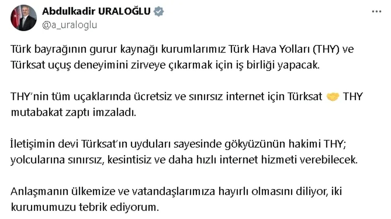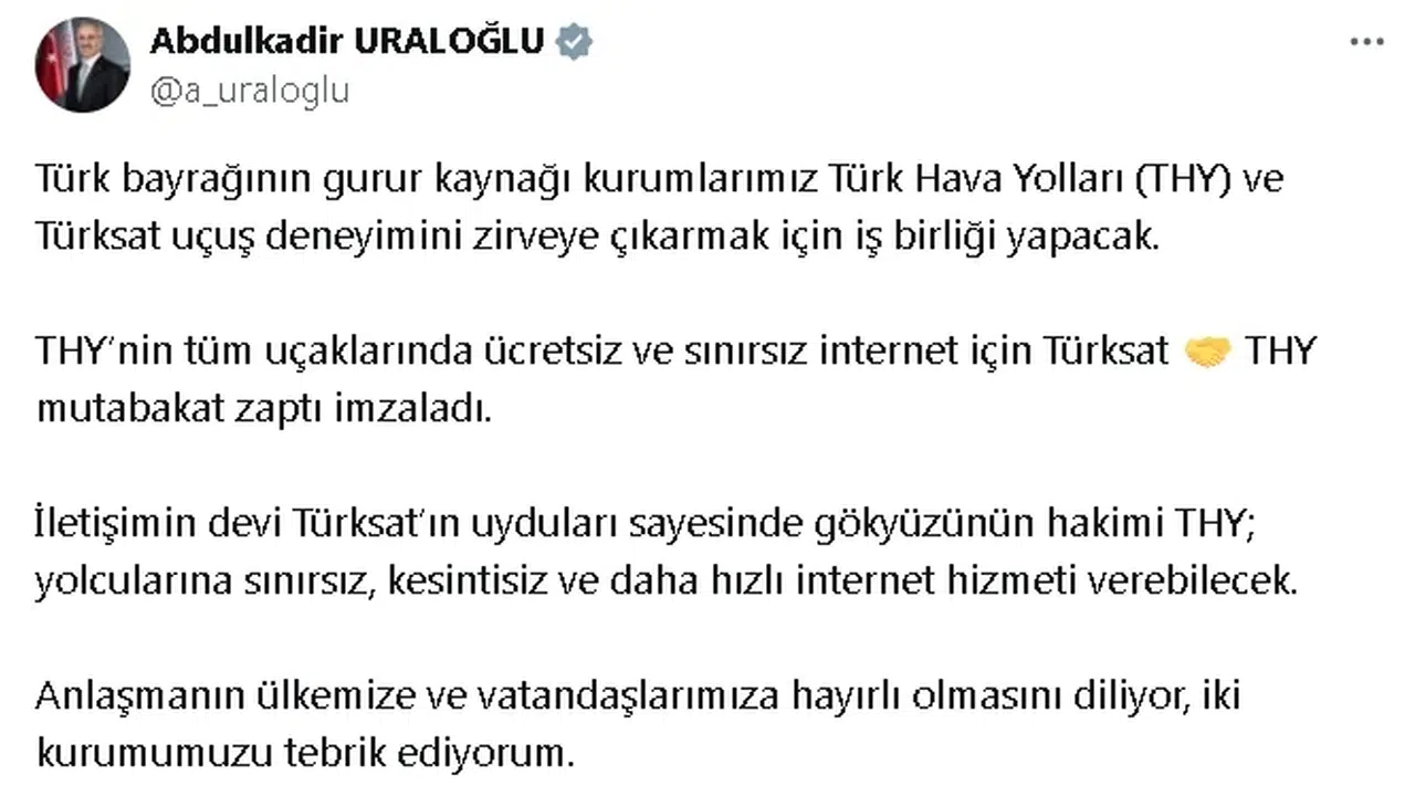 Salih HÜDAVERDİ/ ANKARA, (DHA)- ULAŞTIRMA ve Altyapı Bakanı Abdülkadir Uraloğlu, Türk Hava Yolları (THY) ve Türksat'ın, THY'nin uçaklarında ücretsiz ve sınırsız internet için mutabakat zaptı imzaladıklarını duyurdu.