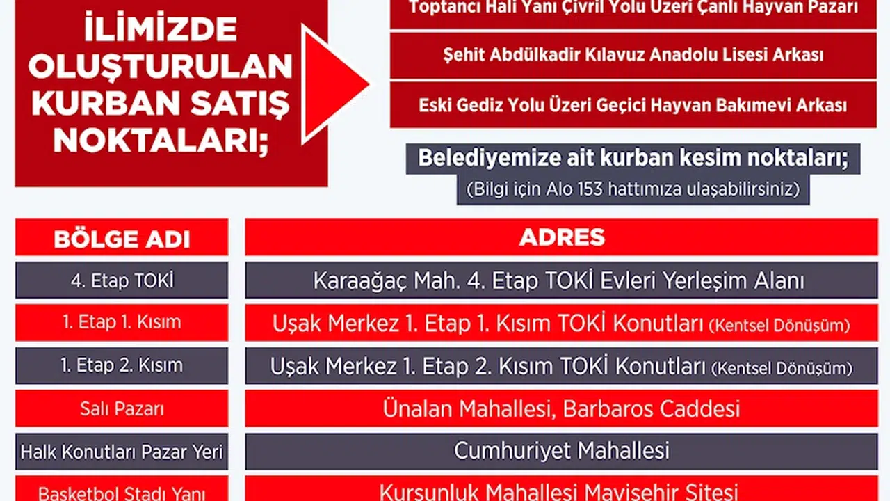 Özel mülkü olmayan vatandaşların kullanabileceği kurban kesim noktalarının da Karaağaç Mahallesi 4. Etap TOKİ Evleri Yerleşim Alanı, Uşak merkez 1. Etap 1. Kısım TOKİ Konutları (Kentsel Dönüşüm), Uşak merkez 1. Etap 2. Kısım TOKİ Konutları (Kentsel Dönüşüm), Ünalan Mahallesi Barbaros Caddesi Salı Pazarı, Cumhuriyet Mahallesi Halk Konutları Pazar Yeri, Kurşunluk Mahallesi Mavişehir Sitesi Basketbol Sahası yanı, Yeni Hayvan Pazarı Atatürk Mahallesi, Vatan Caddesi Toptancı Hali Yanı Çivril Yolu, Cumhuriyet Mahallesi Kapalı Pazar Yeri Aybey Mahallesi, 5. Etap TOKİ Konutları, Durak Mahallesi, Kentsel Dönüşüm TOK Konutları, TOKİ İlkokulu yanı olarak duyuruldu.