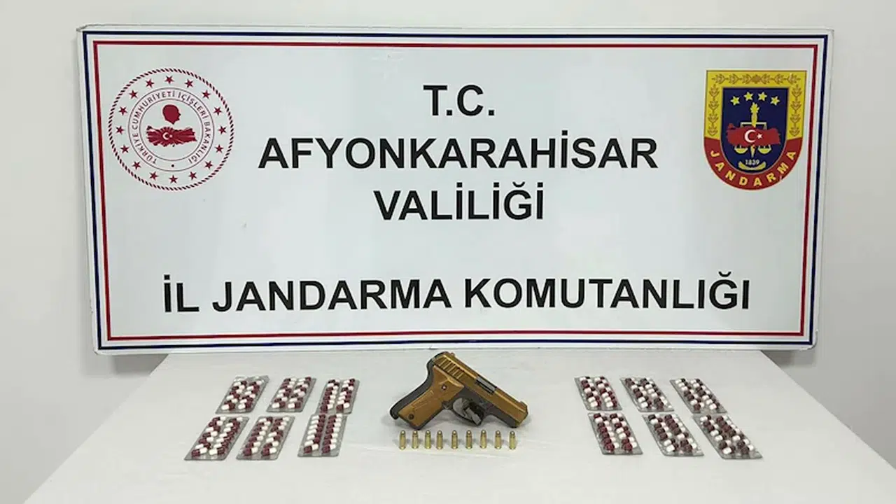 Afyonkarahisar İl Jandarma Komutanlığı ekipleri Uşak'tan uyuşturucu getireceğini belirlediği şüphelileri takibe aldı. Uşak'tan Afyonkarahisar'a giriş noktası olan Sinanpaşa ilçesi Düzağaç beldesinde yapılan yol kontrol ve arama faaliyetinde şüpheli araç jandarma tarafından durduruldu. Adli makamlardan alınan arama kararı sonrası araçta ve içerisinde bulunan A.Ç., C.B., C.T., A.K., E.Ö. ve M.Ö.'nün üzerinde arama yapıldı. Bunun sonucunda 166 sentetik hap, 3 boş kovan, tabanca, şarjör, 9 tabanca fişeği ele geçirildi. E.Ö. ve M.Ö. gözaltına alınırken, olayla ilgili adli soruşturma başlatıldı. (DHA)