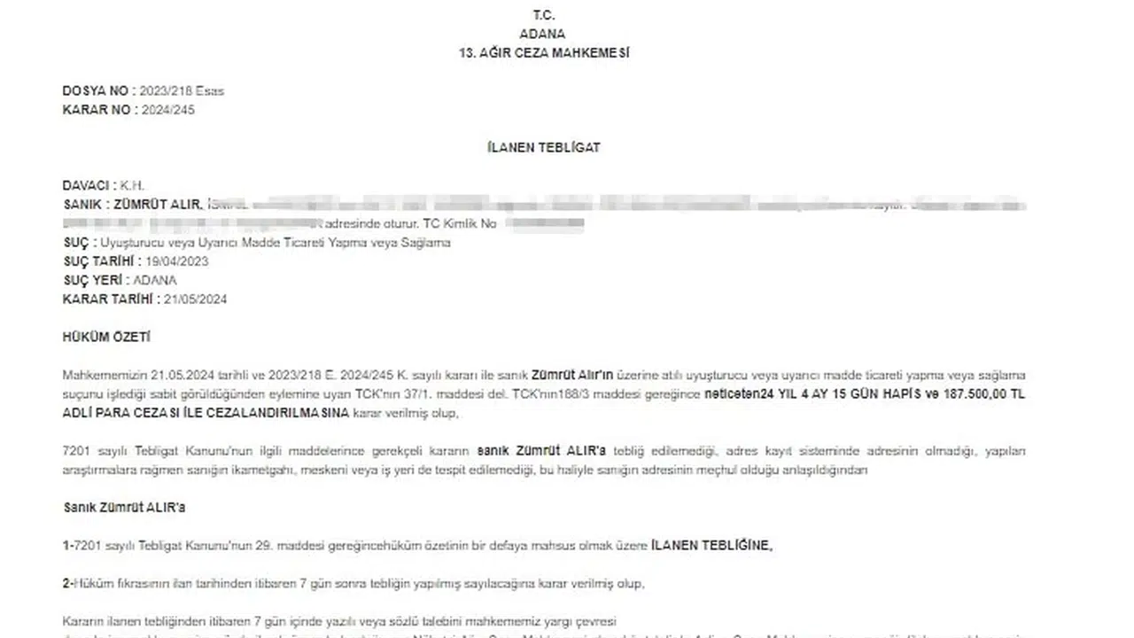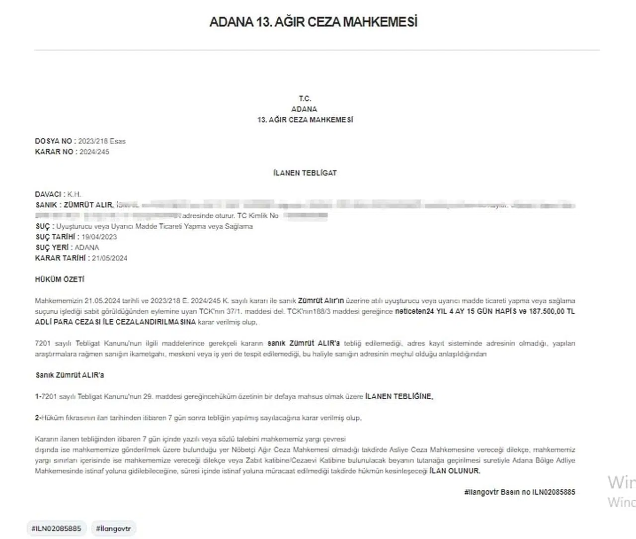 Neşet KARADAĞ/ADANA, (DHA)- ADANA’da, Zümrüt Alır’a (27) uyuşturucu ticareti suçundan 24 yıl 4 ay 15 gün hapis cezasının gerekçeli kararı, sanık tüm aramalara rağmen bulunamadığı için mahkeme tarafından internet sitesine verilen ilanla tebliğ edildi.