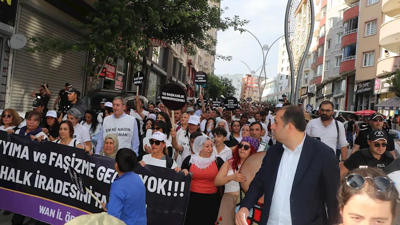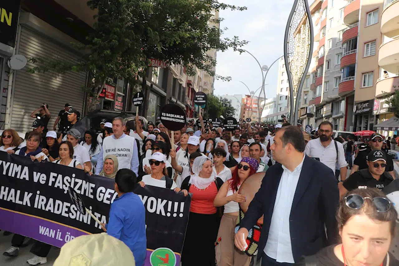 Demokratik Bölgeler Partisi (DBP), Özgür Kadın Hareketi (TJA), Halkların Eşitlik ve Demokrasi Partisi (DEM Parti), öncülüğünde milletvekilleri, demokratik kitle örgütleri, il, ilçe belediye eş başkanları ve parti yöneticilerinin katılımıyla Van'dan Hakkari'ye 'İradeye Saygı yürüyüşü' düzenlendi. Hakkari Belediye Eş Başkanı Mehmet Sıddık Akış'ın görevden alınıp tutuklanmasının ardından, belediyeye kayyım atanmasına karşı tepkiler devam ediyor. İstanbul, Ankara, Muğla, Adana gibi birçok ilden gelenler, kayyım atamalarına karşı Van'da buluştu. DEM Parti Eş Genel Başkanı Tuncer Bakırhan, çeşitli sivil toplum örgütleri, milletvekilleri, belediye eş başkanlarının da aralarında bulunduğu kalabalık, Milli Egemenlik Caddesi üzerindeki Musa Anter Parkında bir araya geldi. 'Kayyım ve faşizme geçit yok', 'Halkın idaresini tanıyın', Belediyeler bizimdir gaspa izin vermeyeceğiz' pankartlarının açıldığı yürüyüş öncesi DEM Parti Eş Genel Başkanı Bakırhan açıklama yaptı.