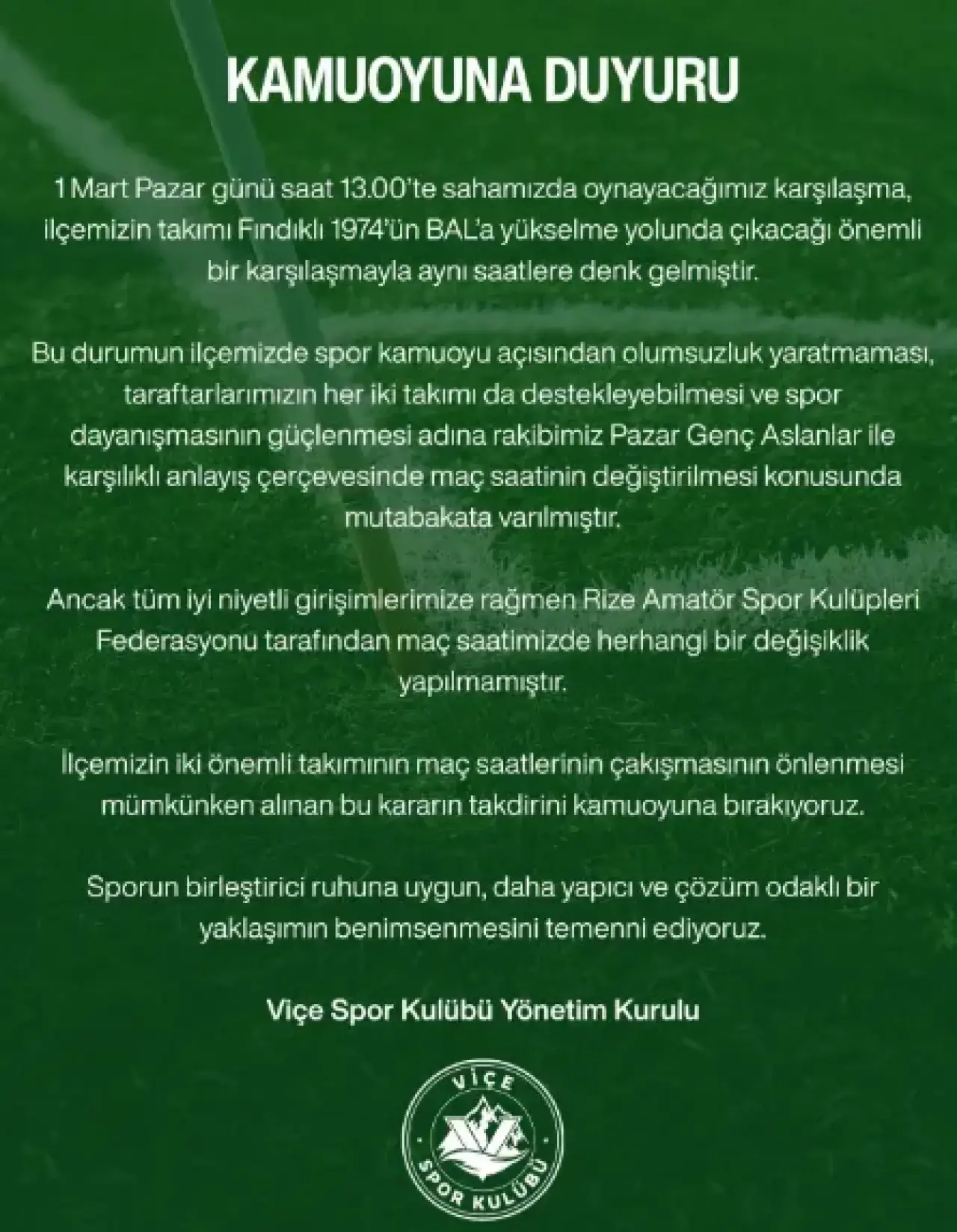 Viçe Spor Kulübü, 1 Mart Pazar günü sahasında oynayacağı maçın saatinin değiştirilmesi talebinin Rize Amatör Spor Kulüpleri Federasyonu tarafından geri çevrilmesine tepki gösterdi. Kulüp, kararın gerekçesiz olduğunu vurgulayarak kamuoyuna duyuru yaptı.