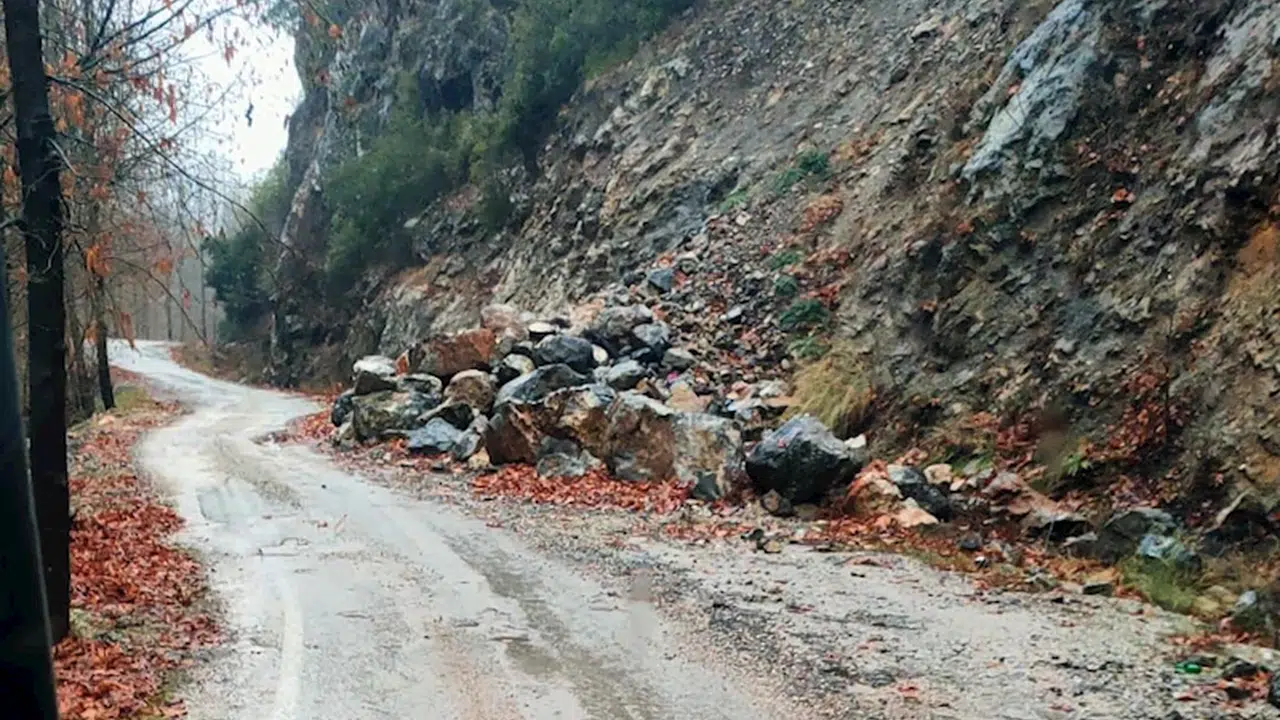 Kadir ÇELİK/İSLAHİYE (Gaziantep),(DHA)- GAZİANTEP’in İslahiye ilçesinde, sağanak yağmur nedeniyle dağdan kopan kaya parçaları yolu trafiğe kapattı.