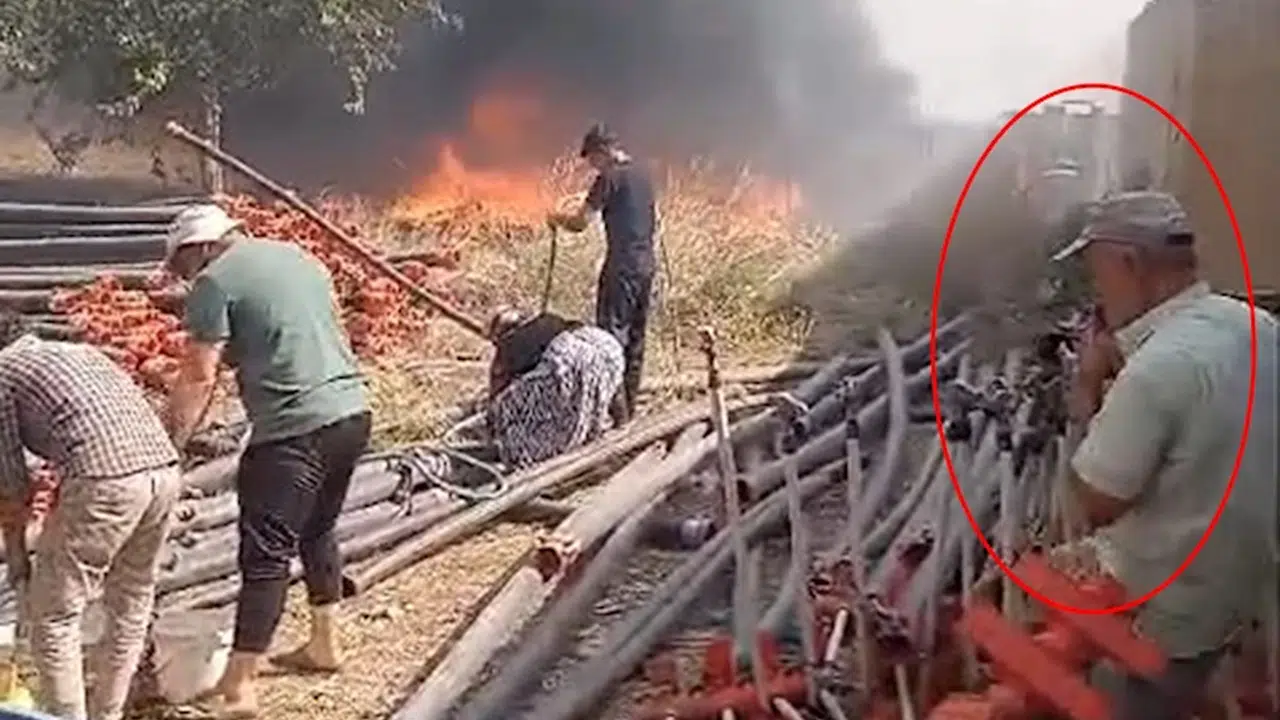 Bir kişinin yangına ağzındaki sigara ile müdahale ettiği, bitince de söndürmeden sulama borularının arasına attığı anlar cep telefonu kamerasına yansıdı.