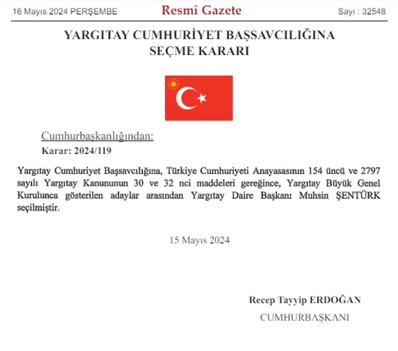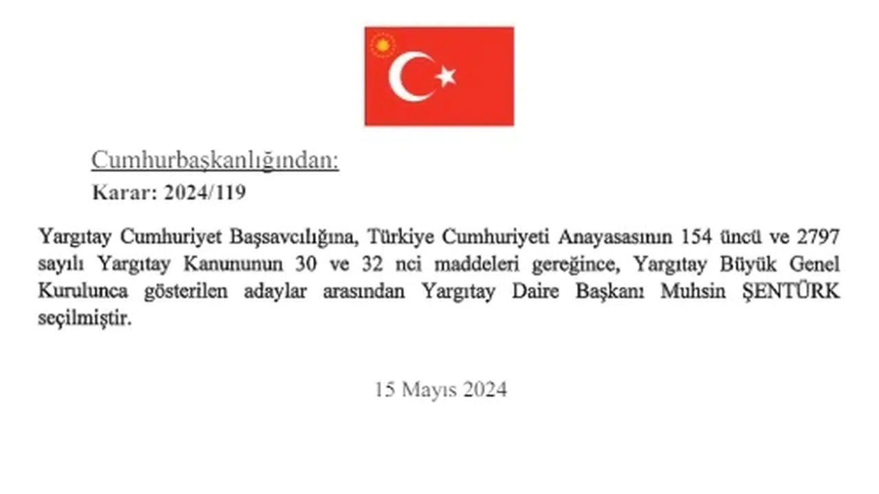 Cumhurbaşkanı Recep Tayyip Erdoğan imzasıyla Resmi Gazete’de yayımlanan kararda, Yargıtay Cumhuriyet Başsavcılığı'na, Türkiye Cumhuriyeti Anayasasının 154 üncü ve 2797 sayılı Yargıtay Kanununun 30 ve 32’nci maddeleri gereğince, Yargıtay Büyük Genel Kurulunca gösterilen adaylar arasından Yargıtay Daire Başkanı Muhsin Şentürk seçildi.